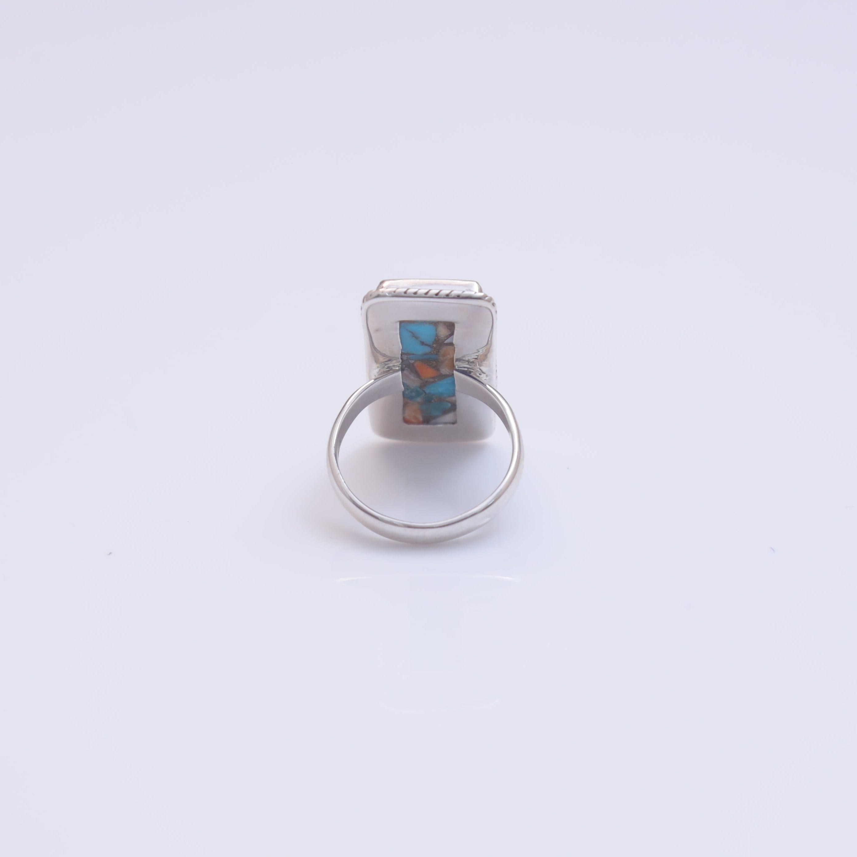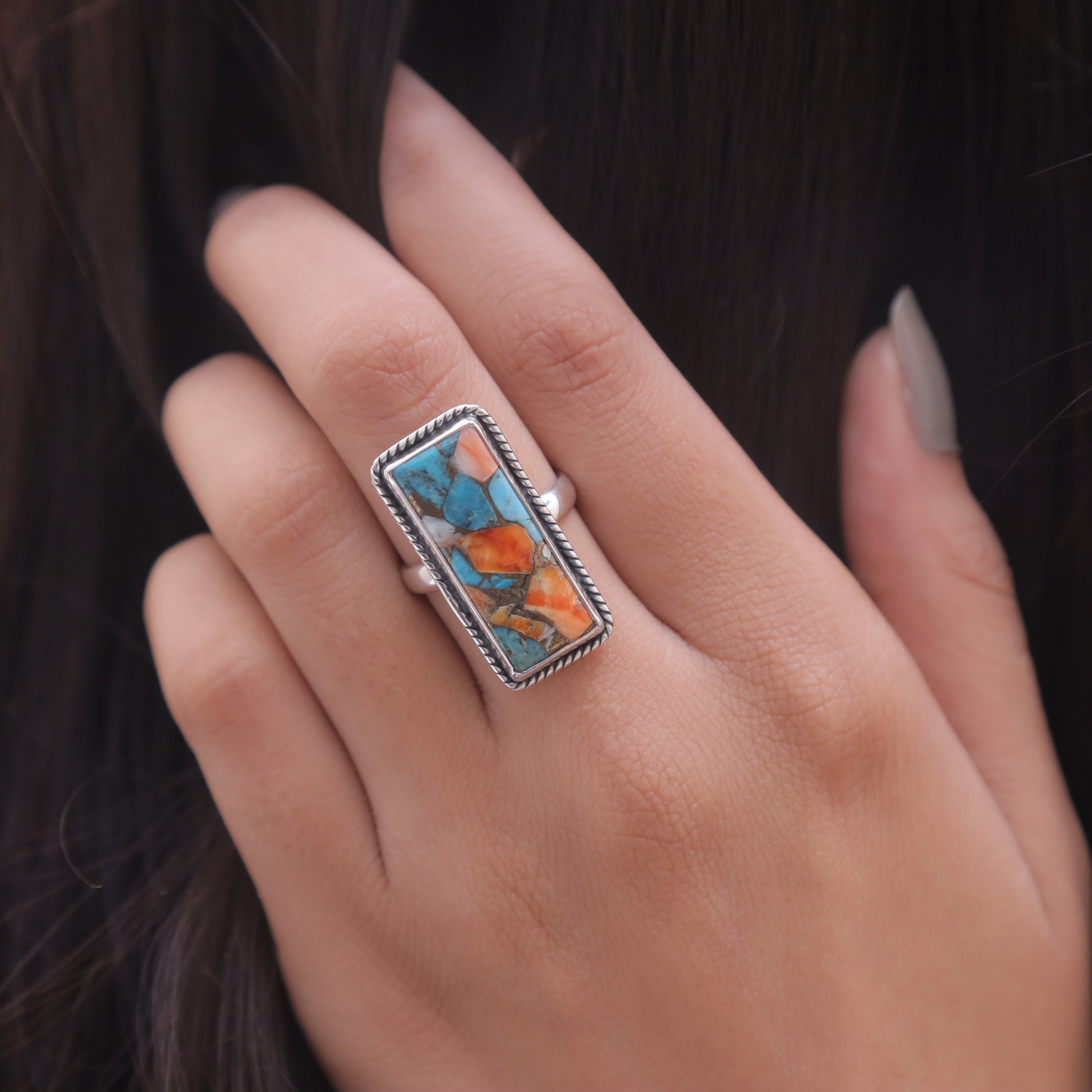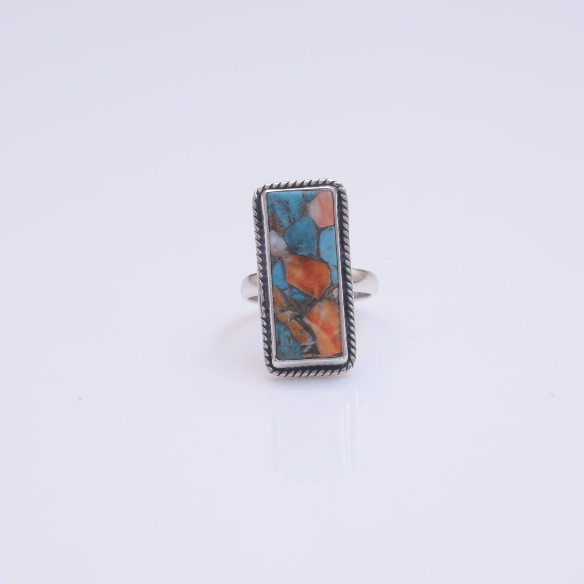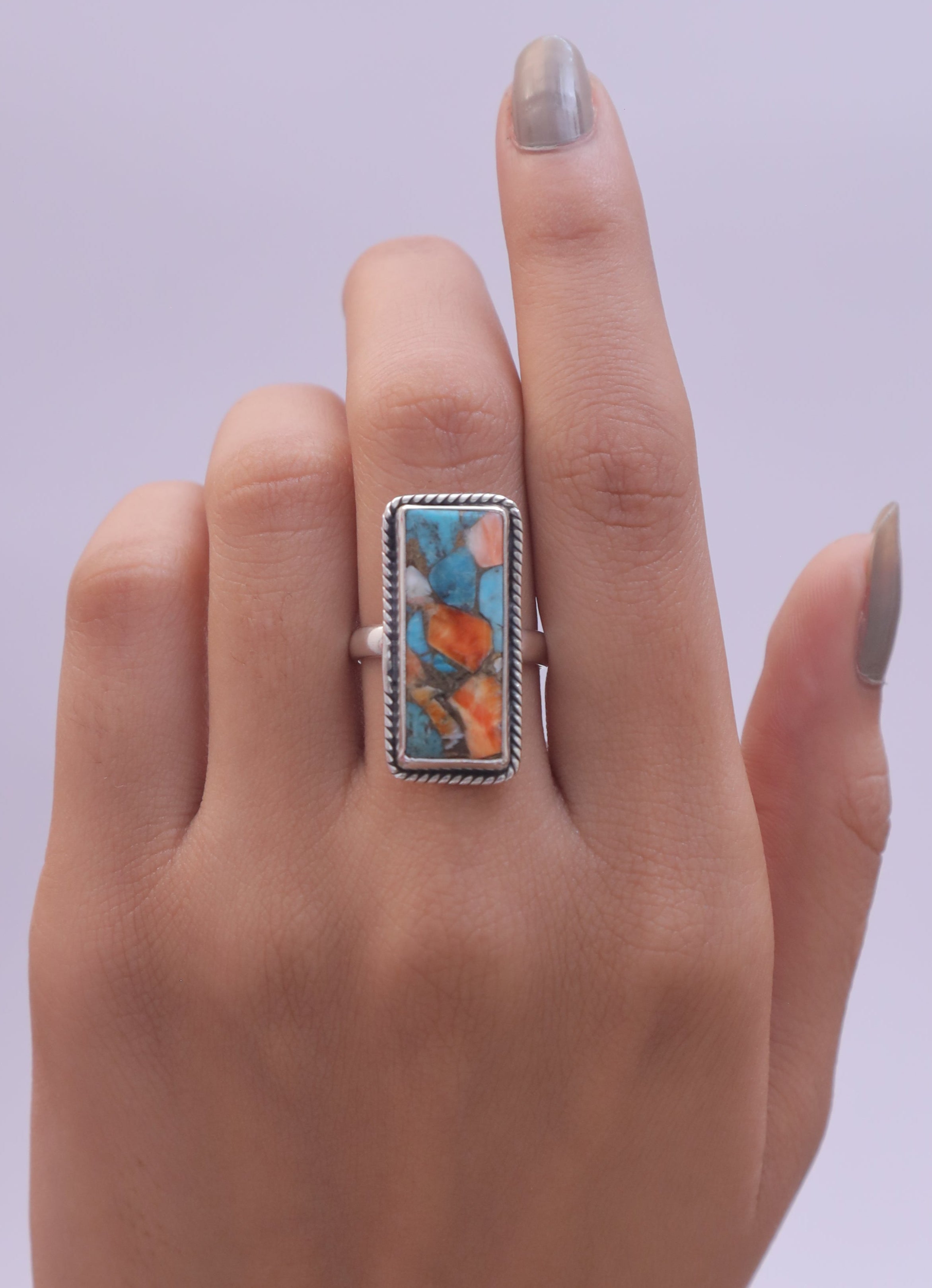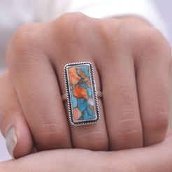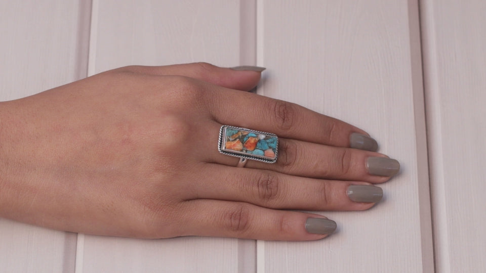 Each detail of the ring showcases expert craftsmanship, from the precisely set prongs securing the Spiny Oyster Turquoise to the polished silver band ensuring a comfortable fit. The design allows the Spiny Oyster Turquoise to shine as the focal point, making it a versatile accessory suitable for everyday wear or special occasions.