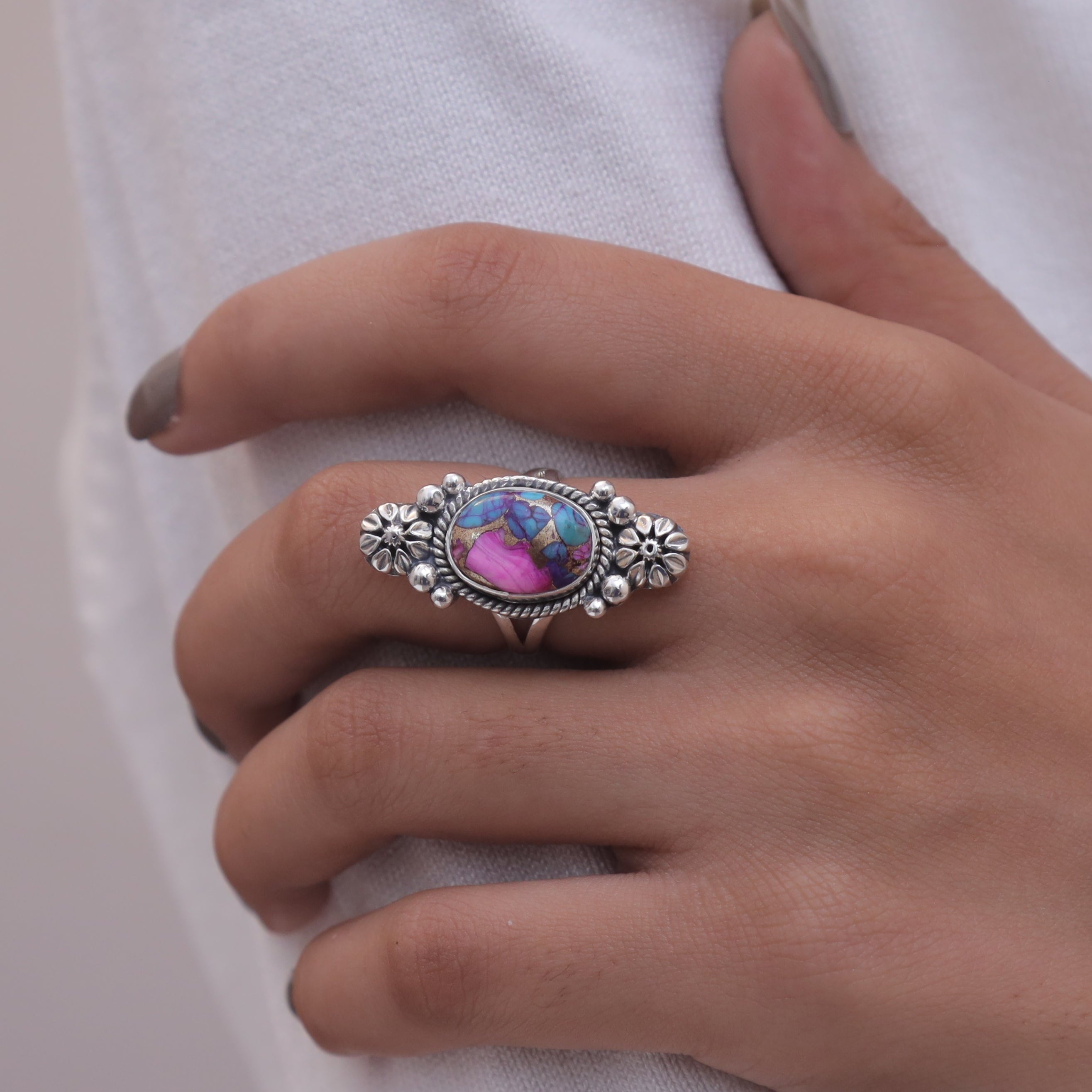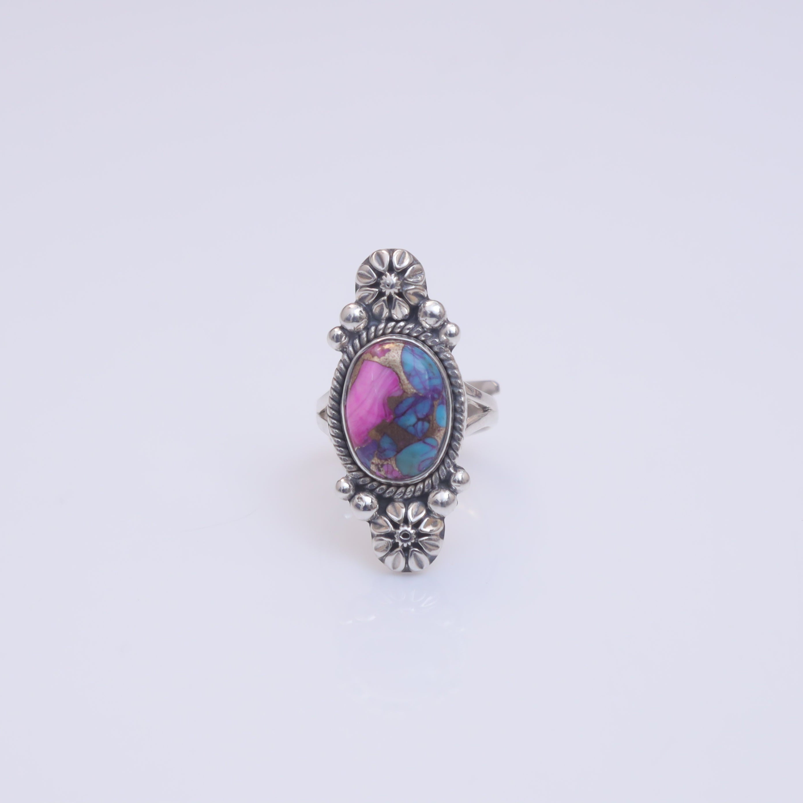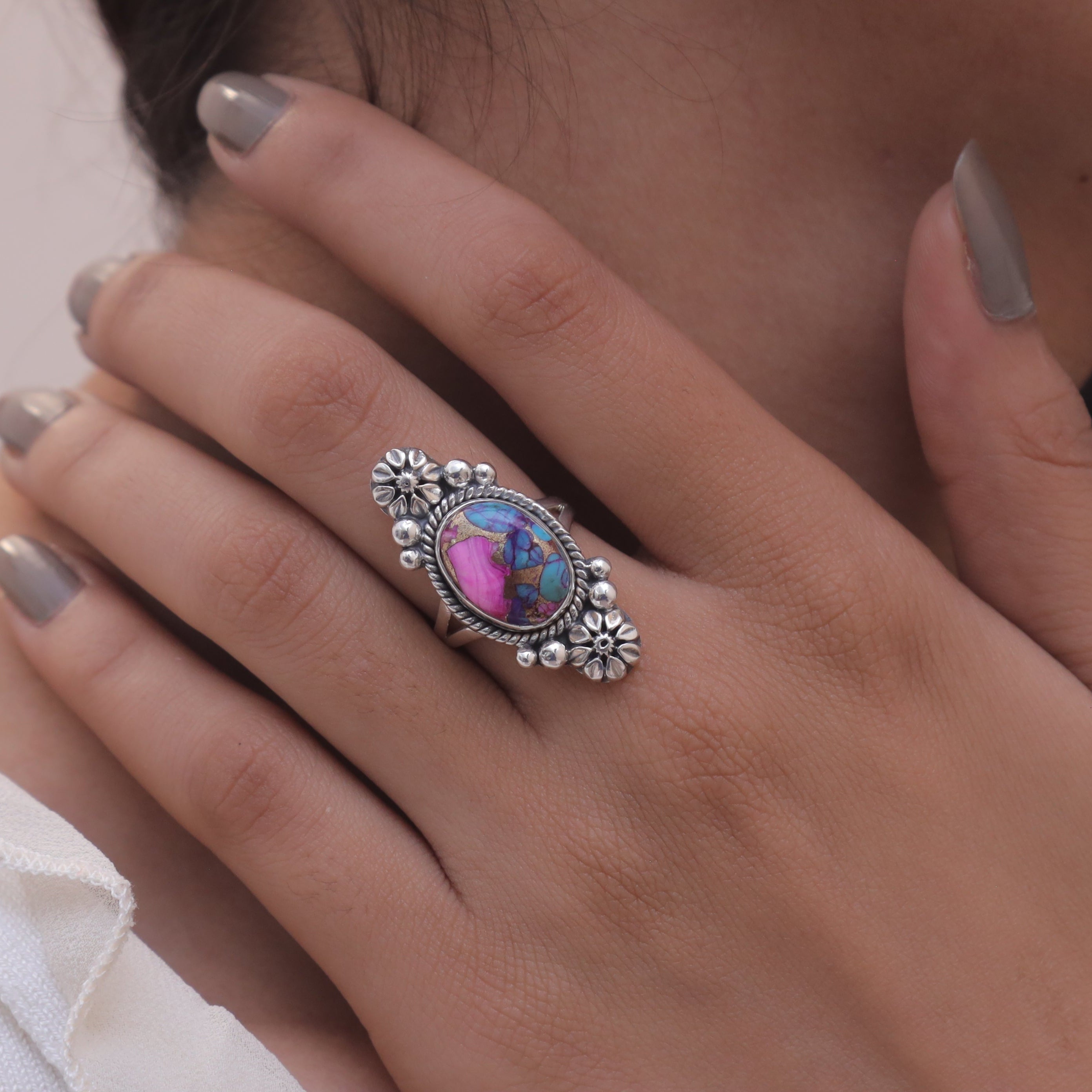 Each detail of the ring showcases expert craftsmanship, from the precisely set prongs securing the Pink Oyster Turquois to the polished silver band ensuring a comfortable fit. The design allows the Pink Oyster Turquois to shine as the focal point, making it a versatile accessory suitable for everyday wear or special occasions.
