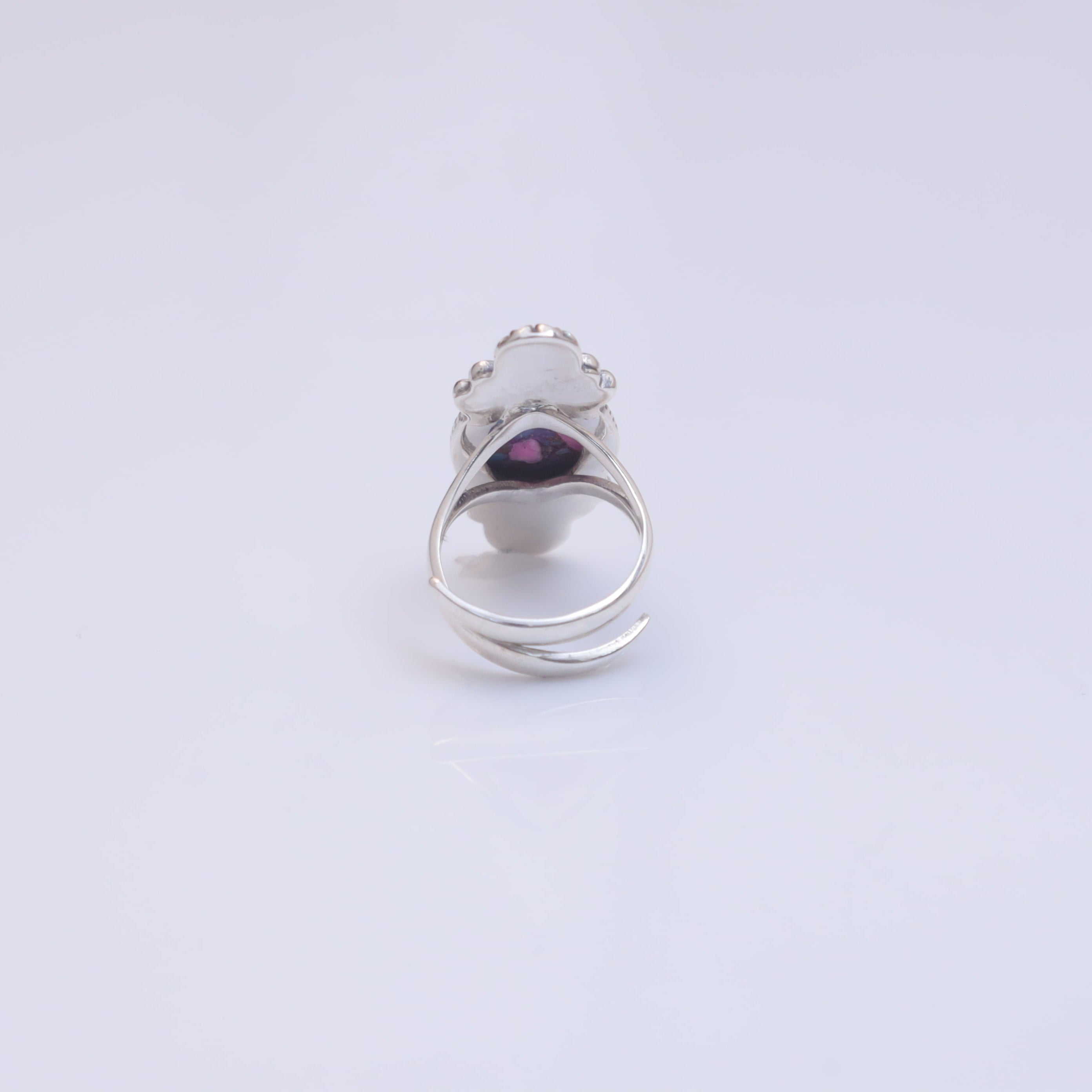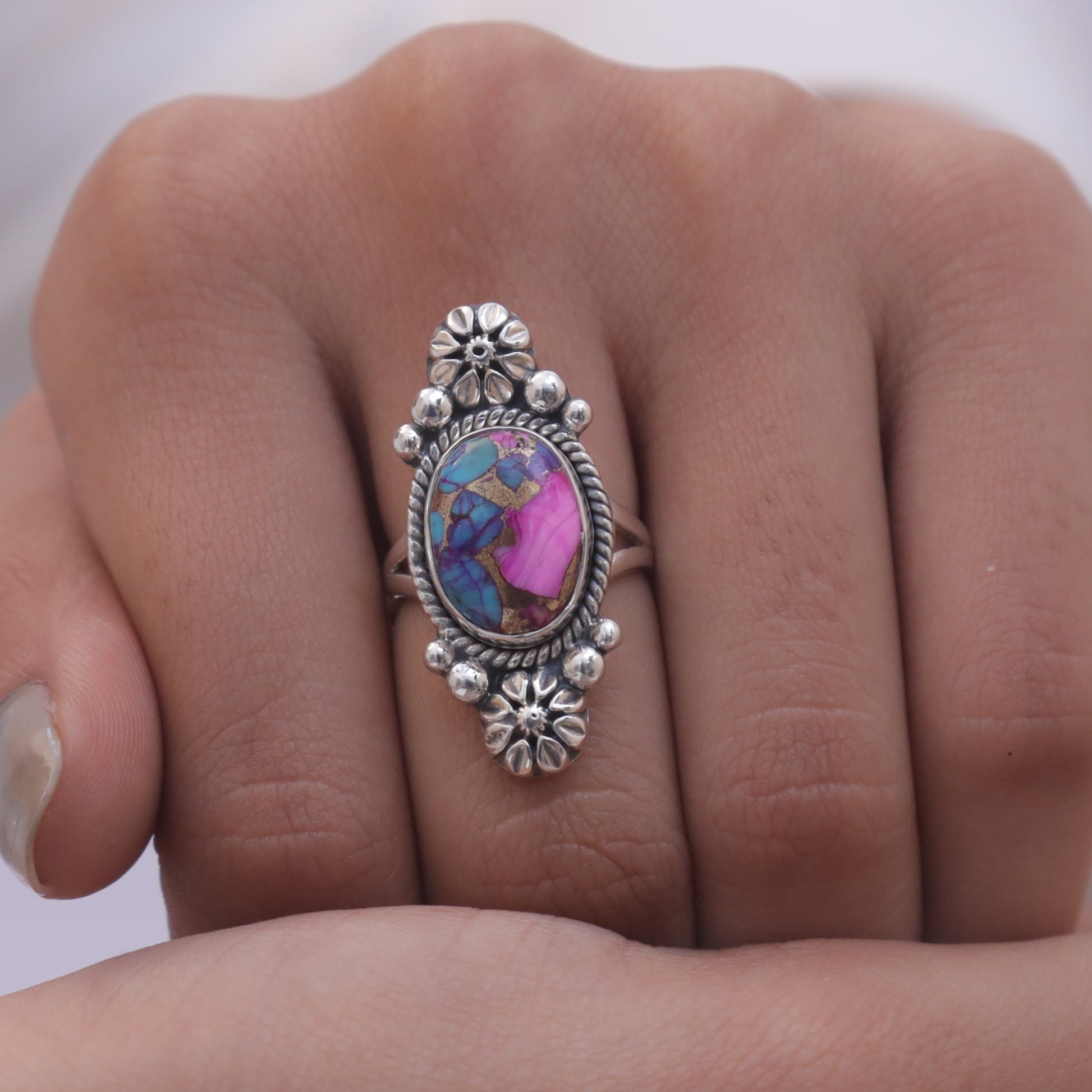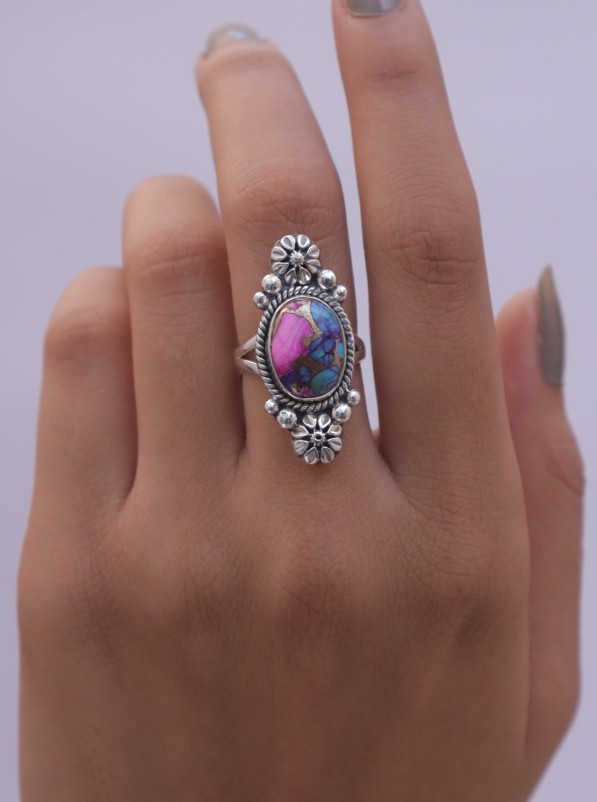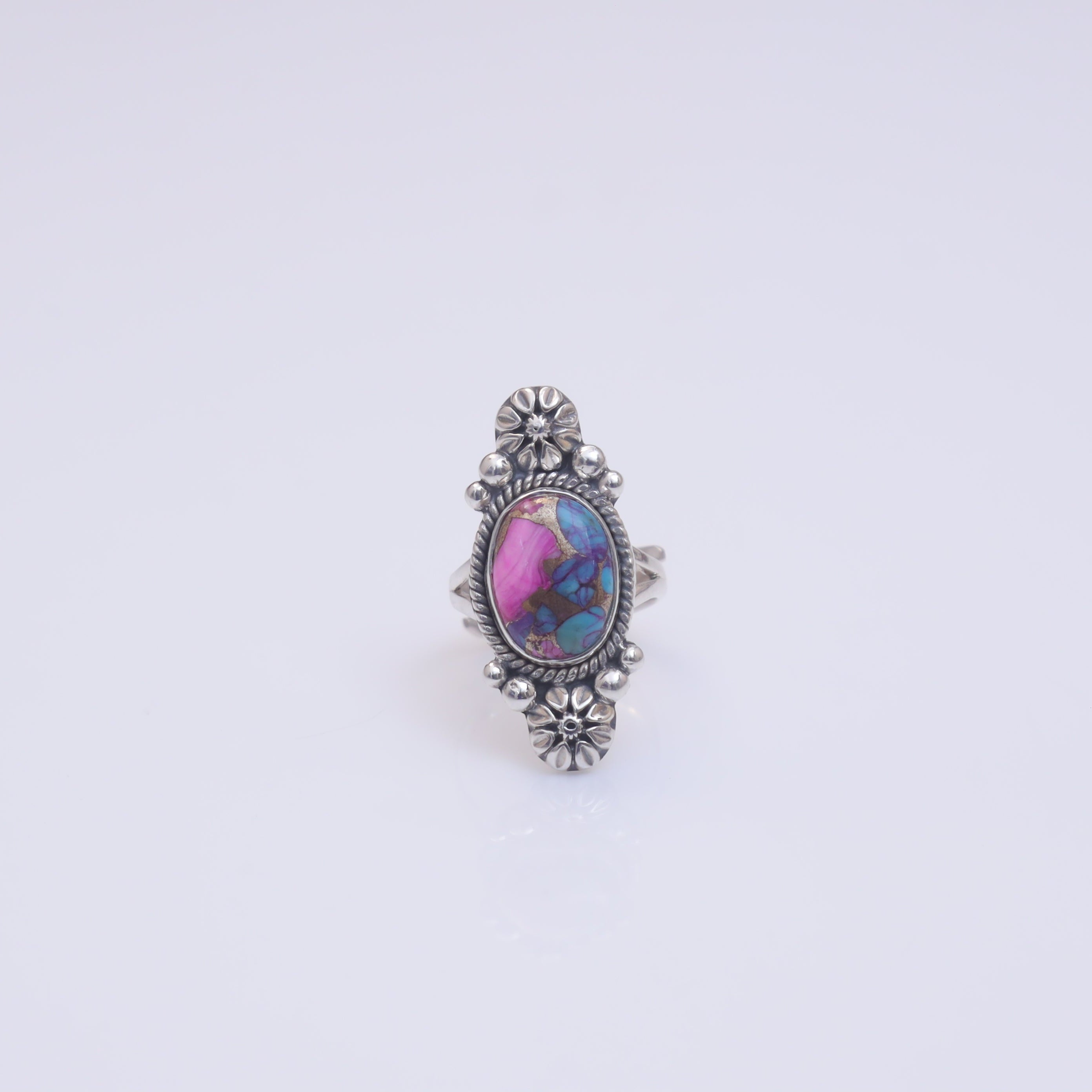Each detail of the ring showcases expert craftsmanship, from the precisely set prongs securing the Pink Oyster Turquois to the polished silver band ensuring a comfortable fit. The design allows the Pink Oyster Turquois to shine as the focal point, making it a versatile accessory suitable for everyday wear or special occasions.