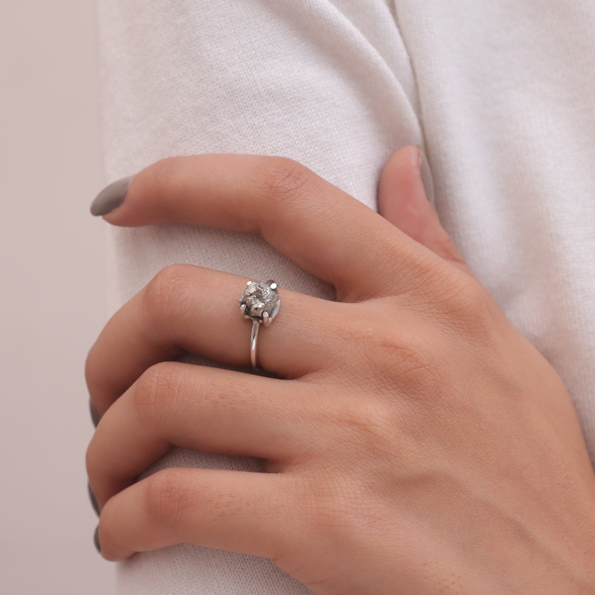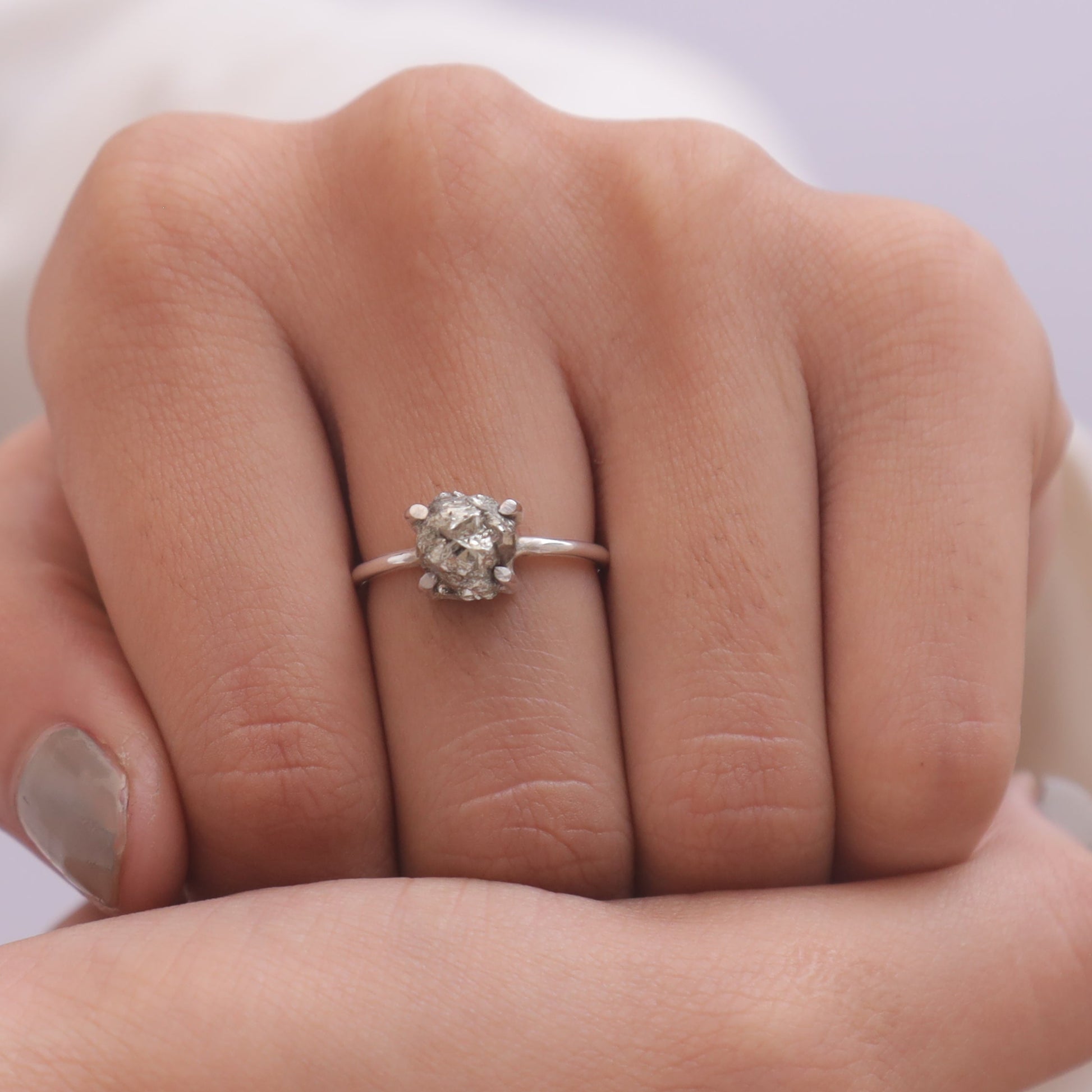 Each detail of the ring showcases expert craftsmanship, from the precisely set prongs securing the Pyrite to the polished silver band ensuring a comfortable fit. The design allows the Pyrite to shine as the focal point, making it a versatile accessory suitable for everyday wear or special occasions.