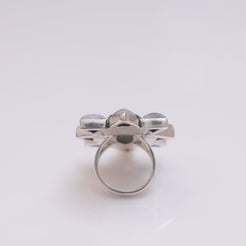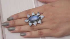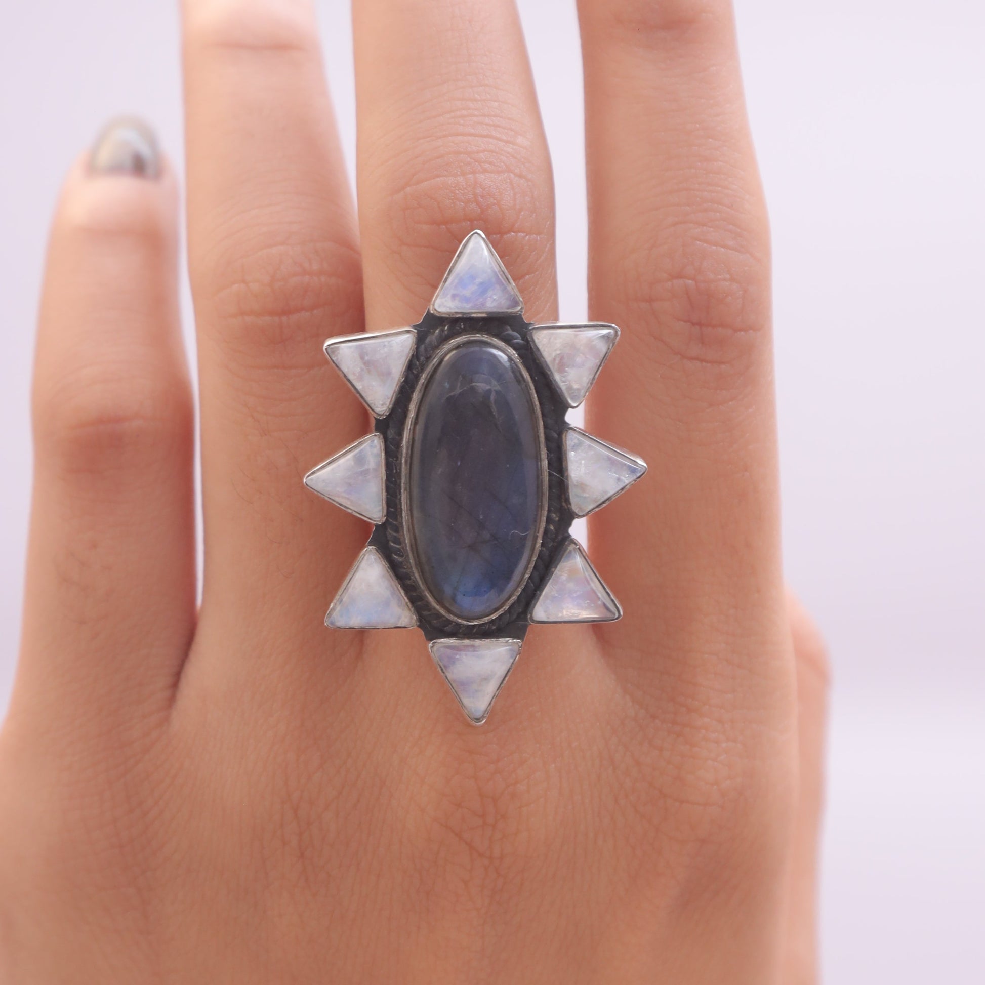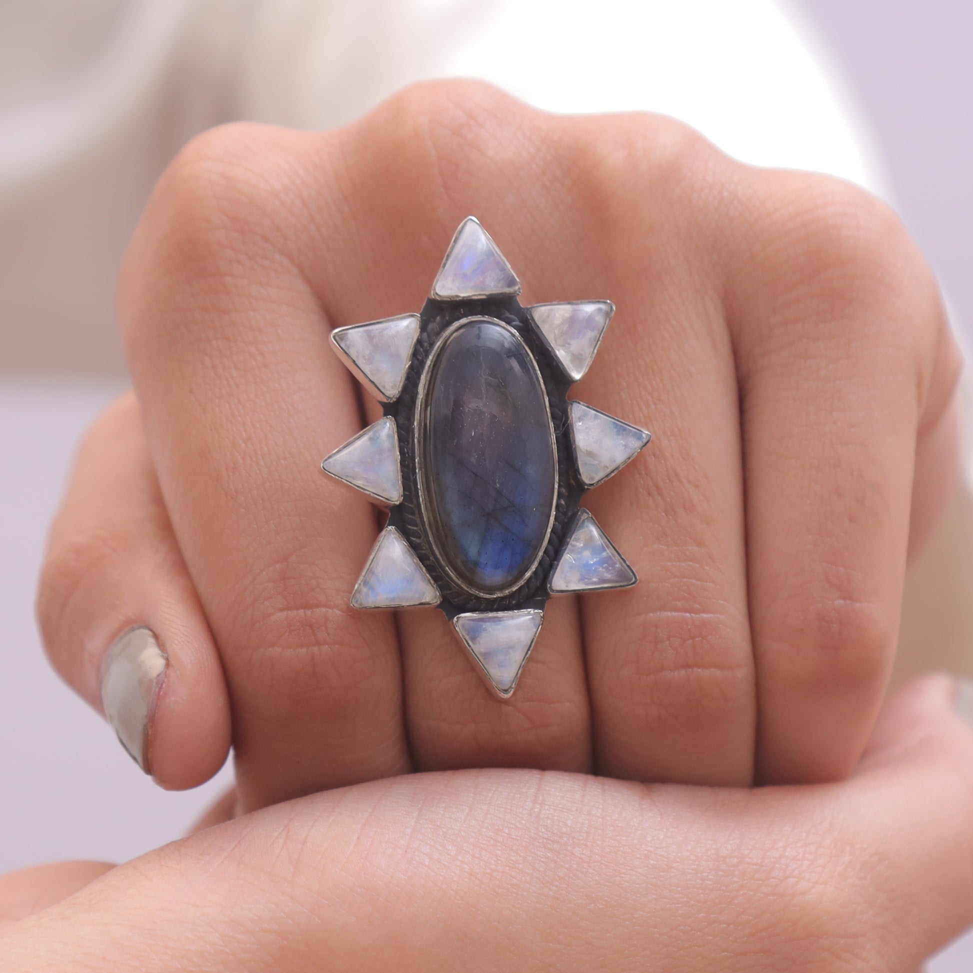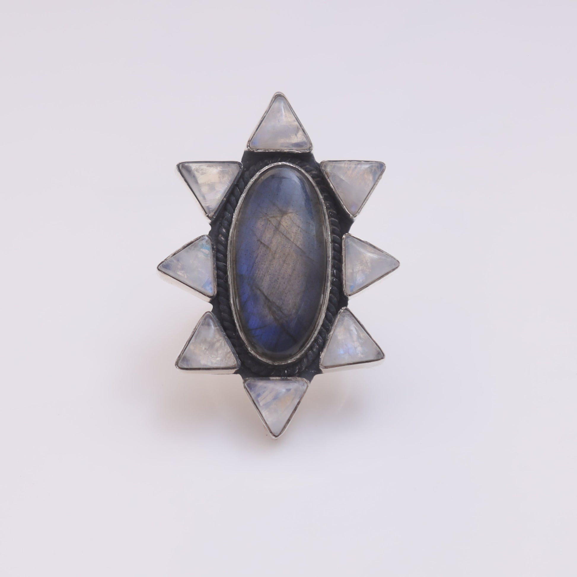 Each detail of the ring showcases expert craftsmanship, from the precisely set prongs securing the Rainbow Moonstone & Labradorite to the polished silver band ensuring a comfortable fit. The design allows the Rainbow Moonstone & Labradorite to shine as the focal point, making it a versatile accessory suitable for everyday wear or special occasions.