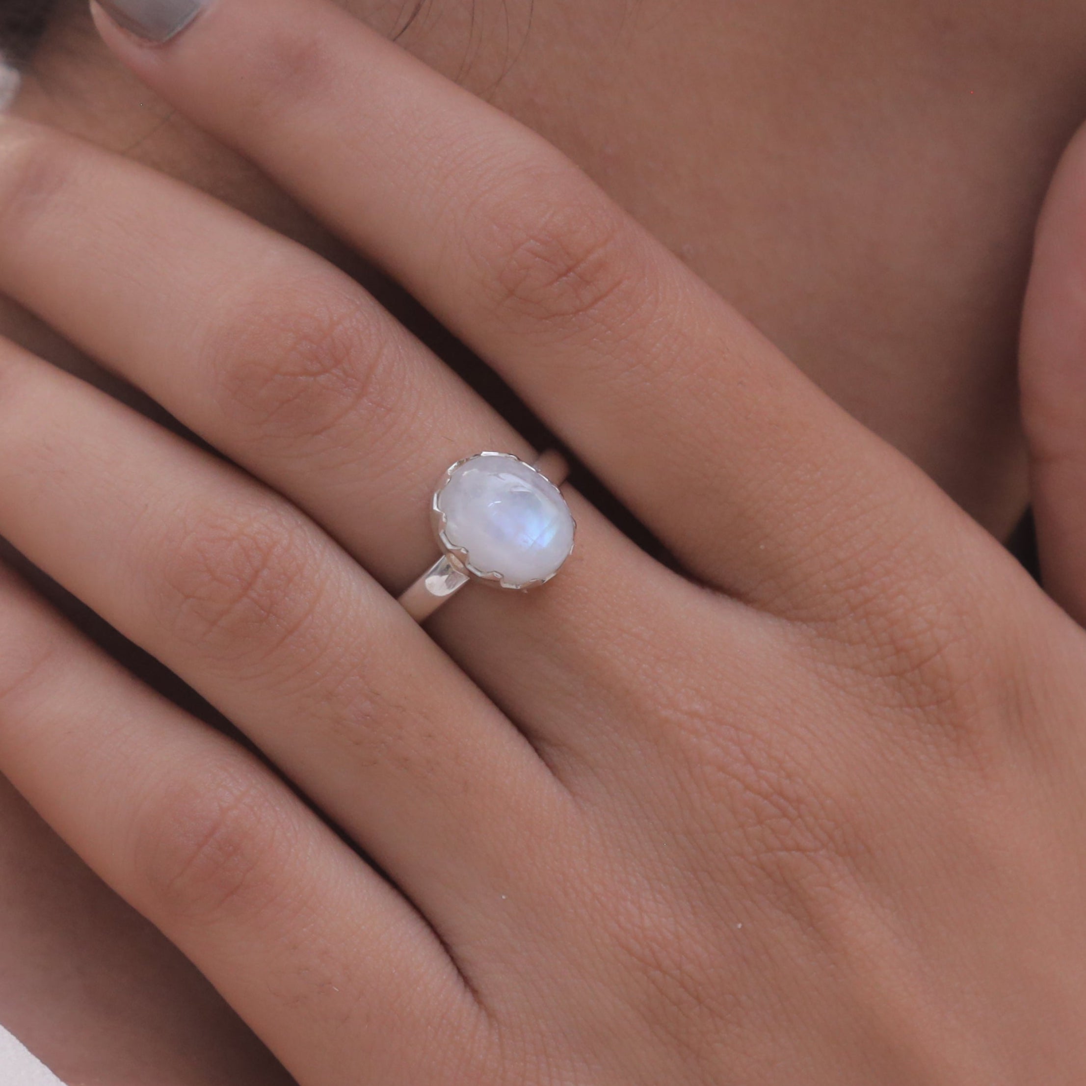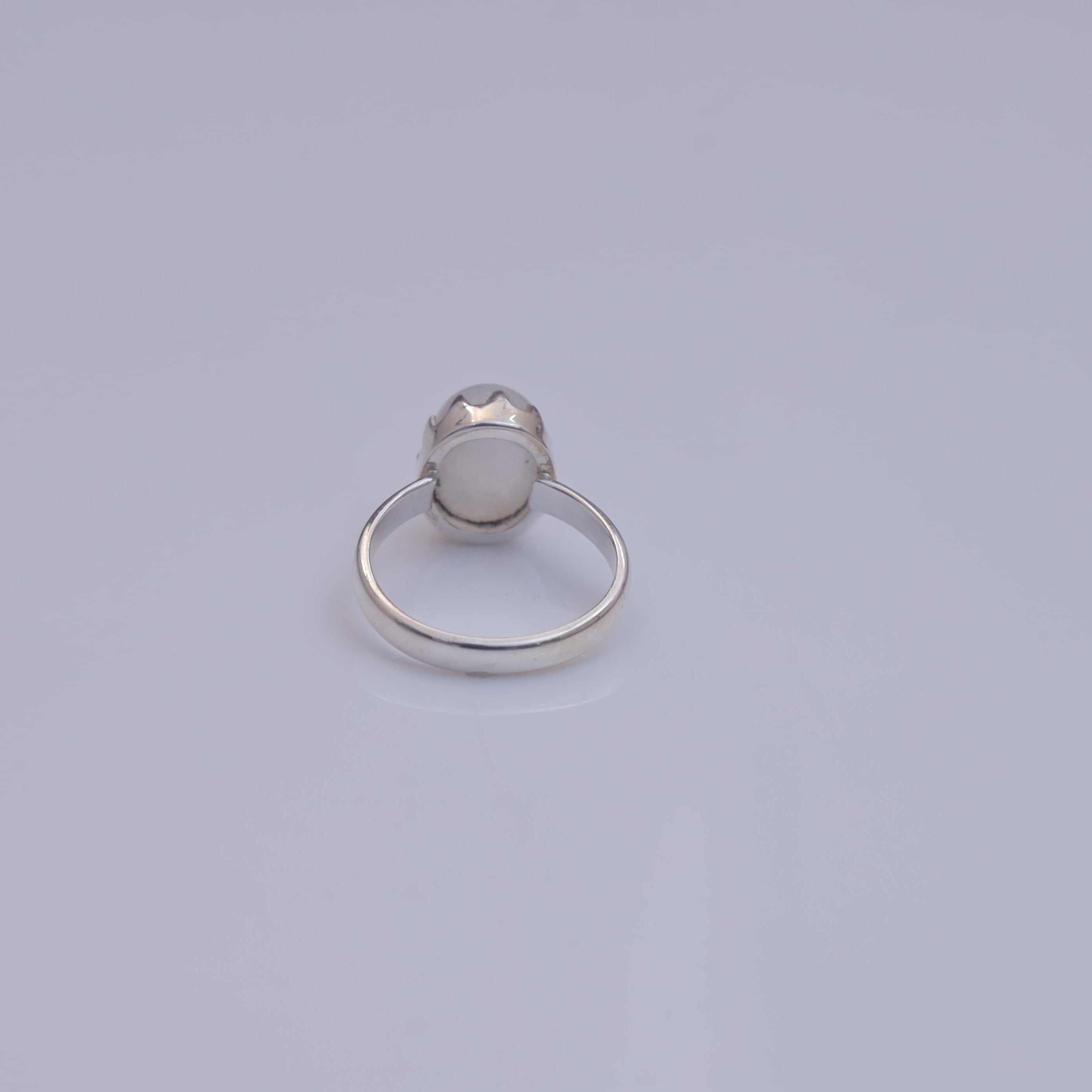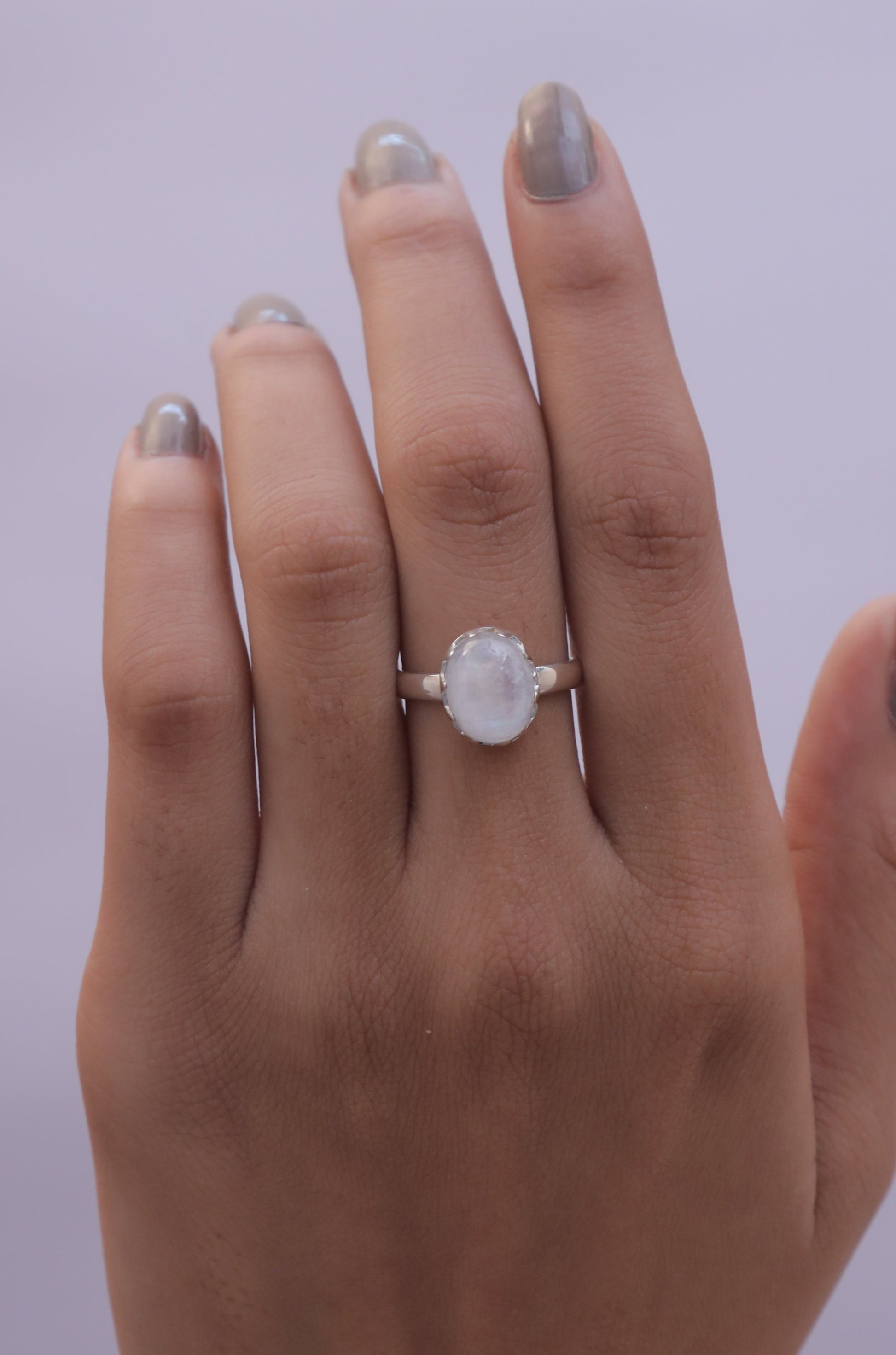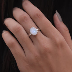 Each detail of the ring showcases expert craftsmanship, from the precisely set prongs securing the Rainbow Moonstone to the polished silver band ensuring a comfortable fit. The design allows the Rainbow Moonstone to shine as the focal point, making it a versatile accessory suitable for everyday wear or special occasions.