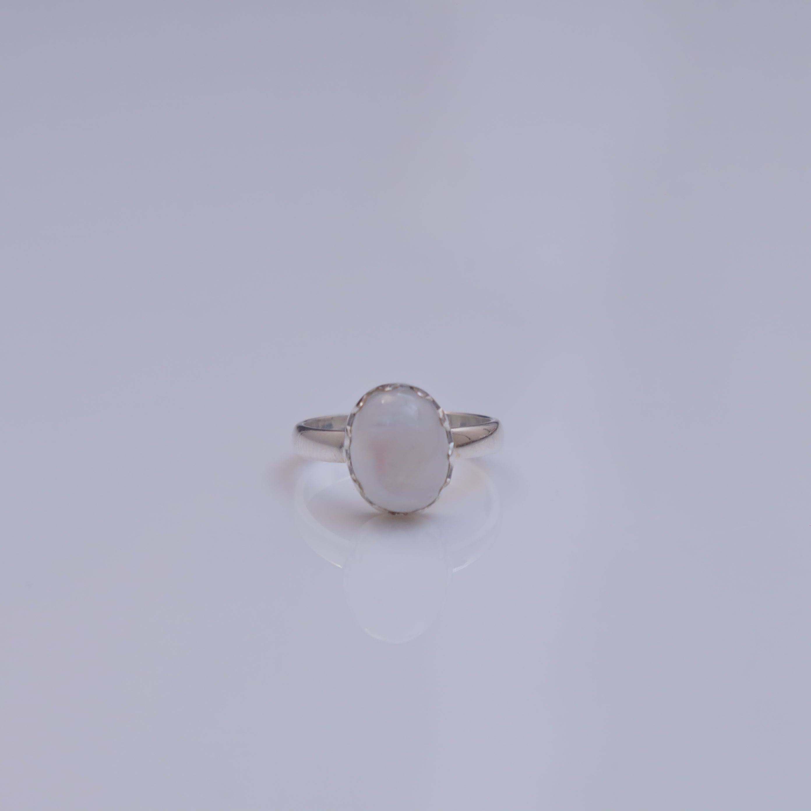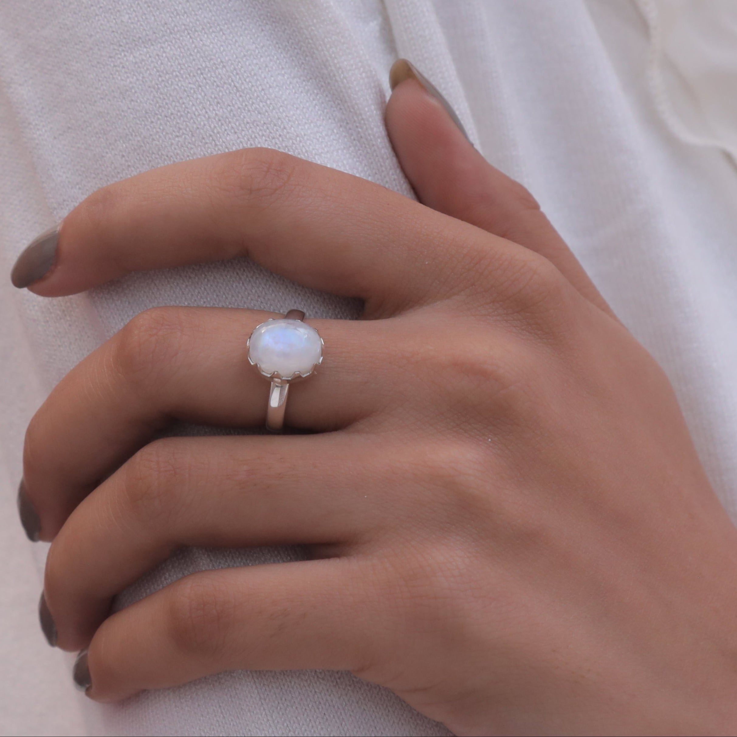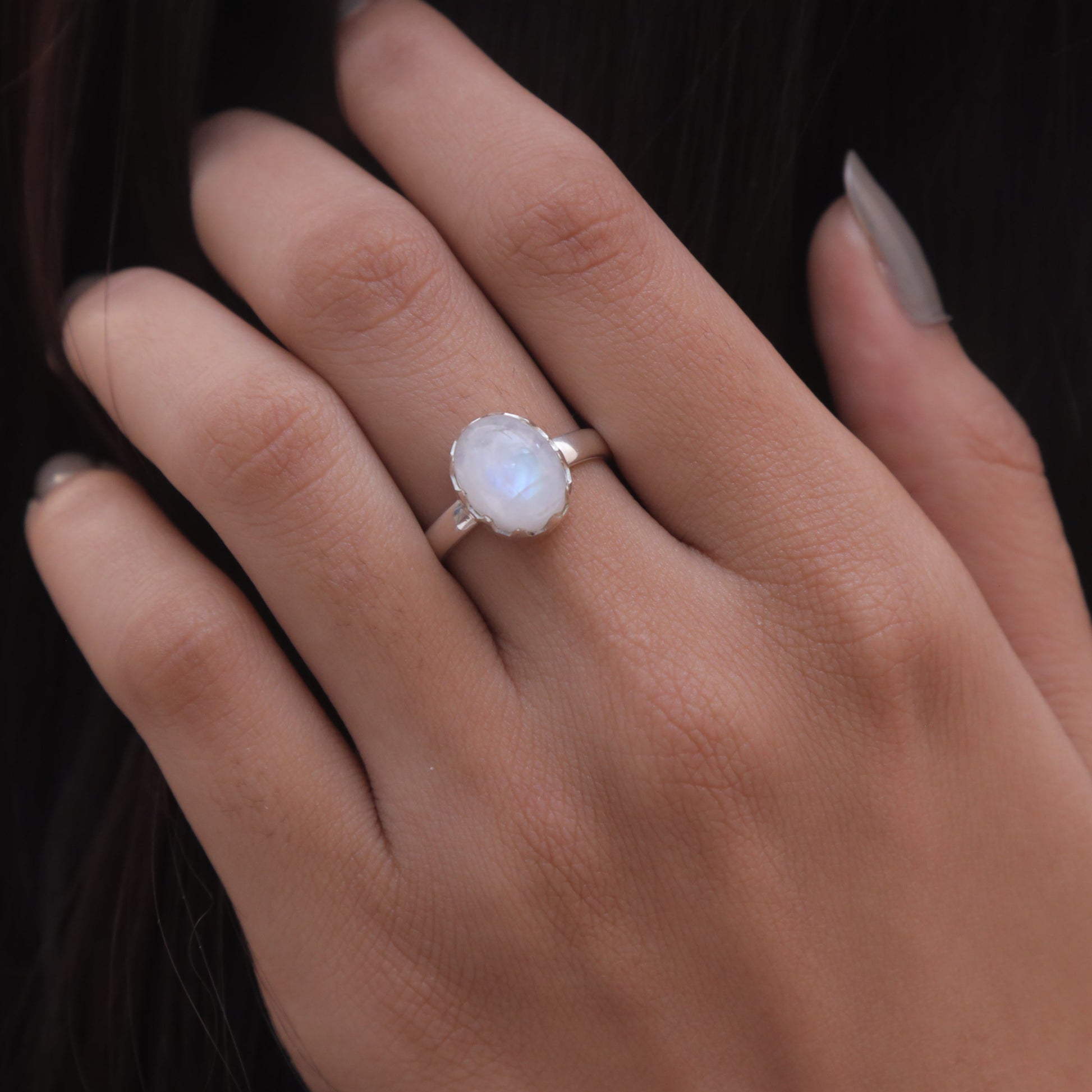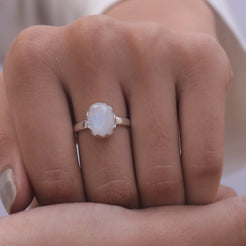 Each detail of the ring showcases expert craftsmanship, from the precisely set prongs securing the Rainbow Moonstone to the polished silver band ensuring a comfortable fit. The design allows the Rainbow Moonstone to shine as the focal point, making it a versatile accessory suitable for everyday wear or special occasions.