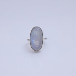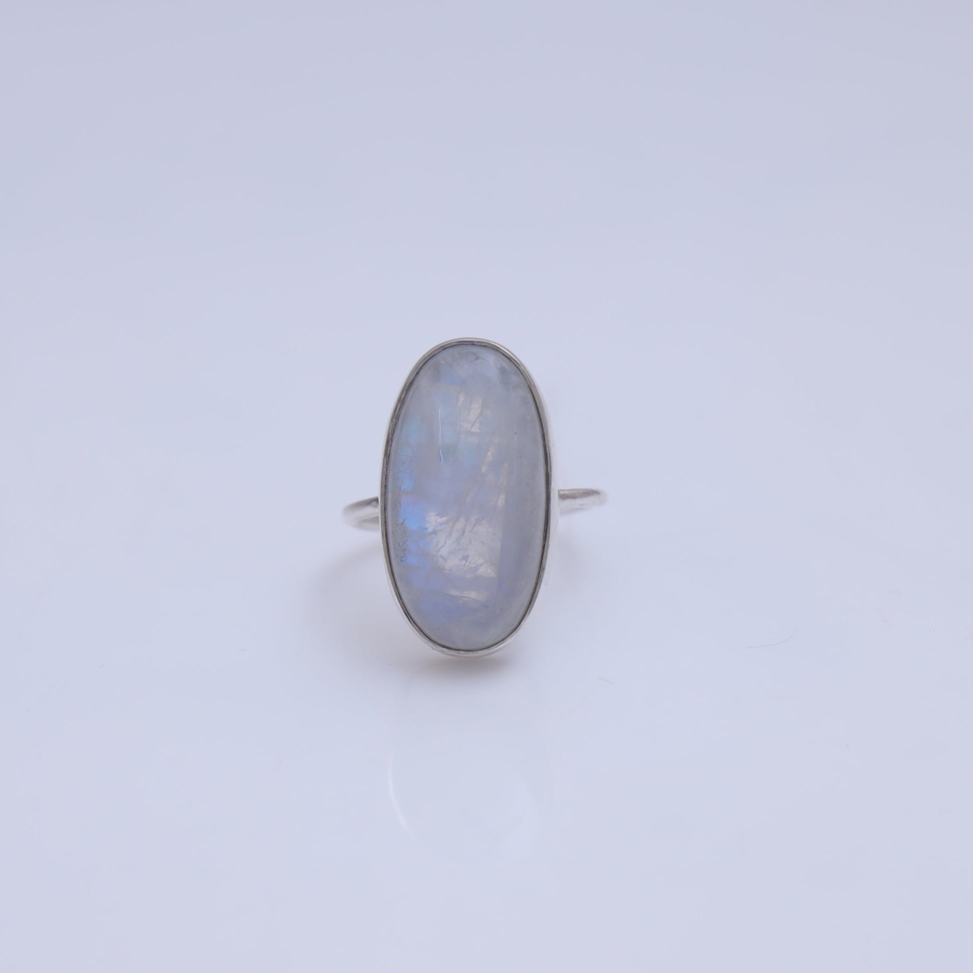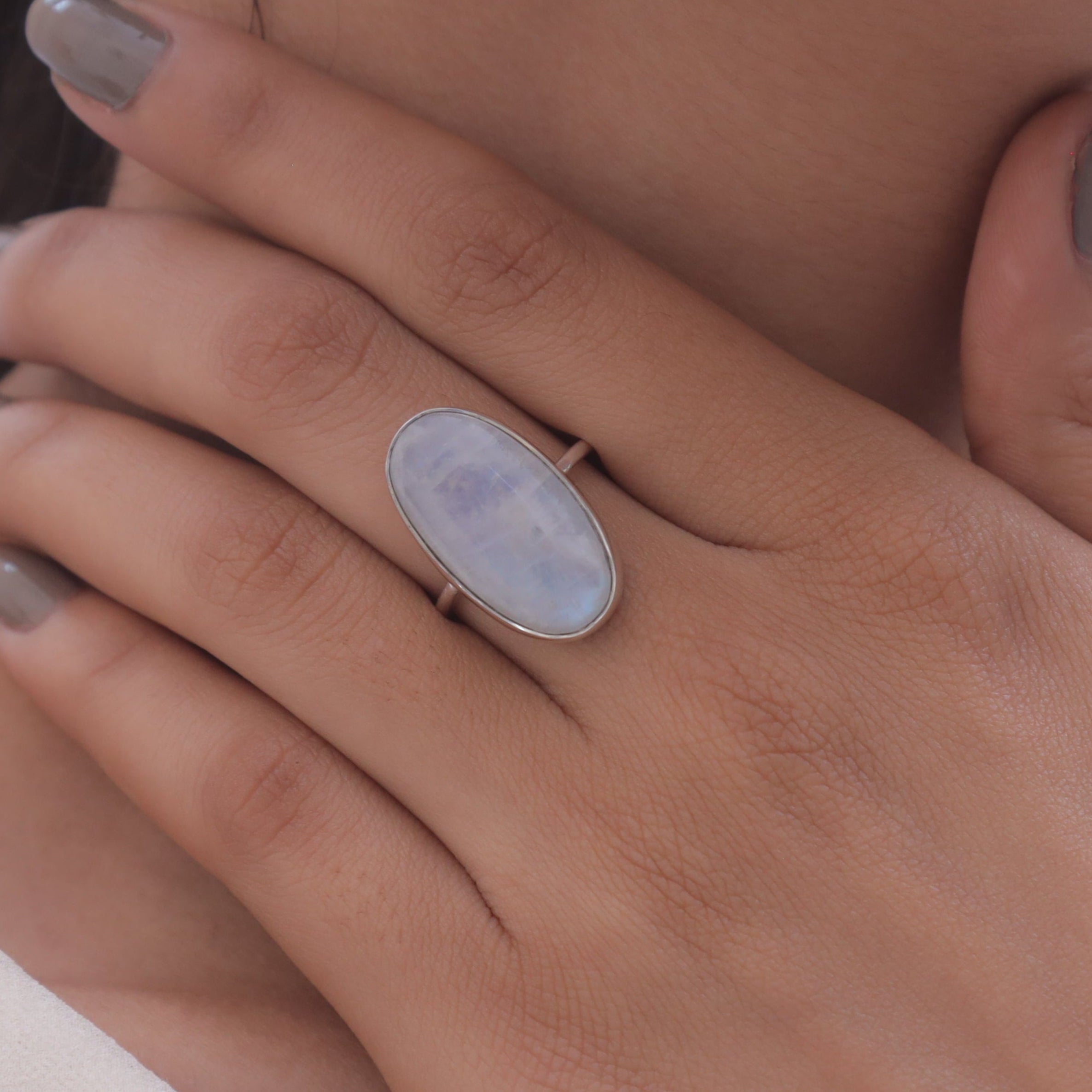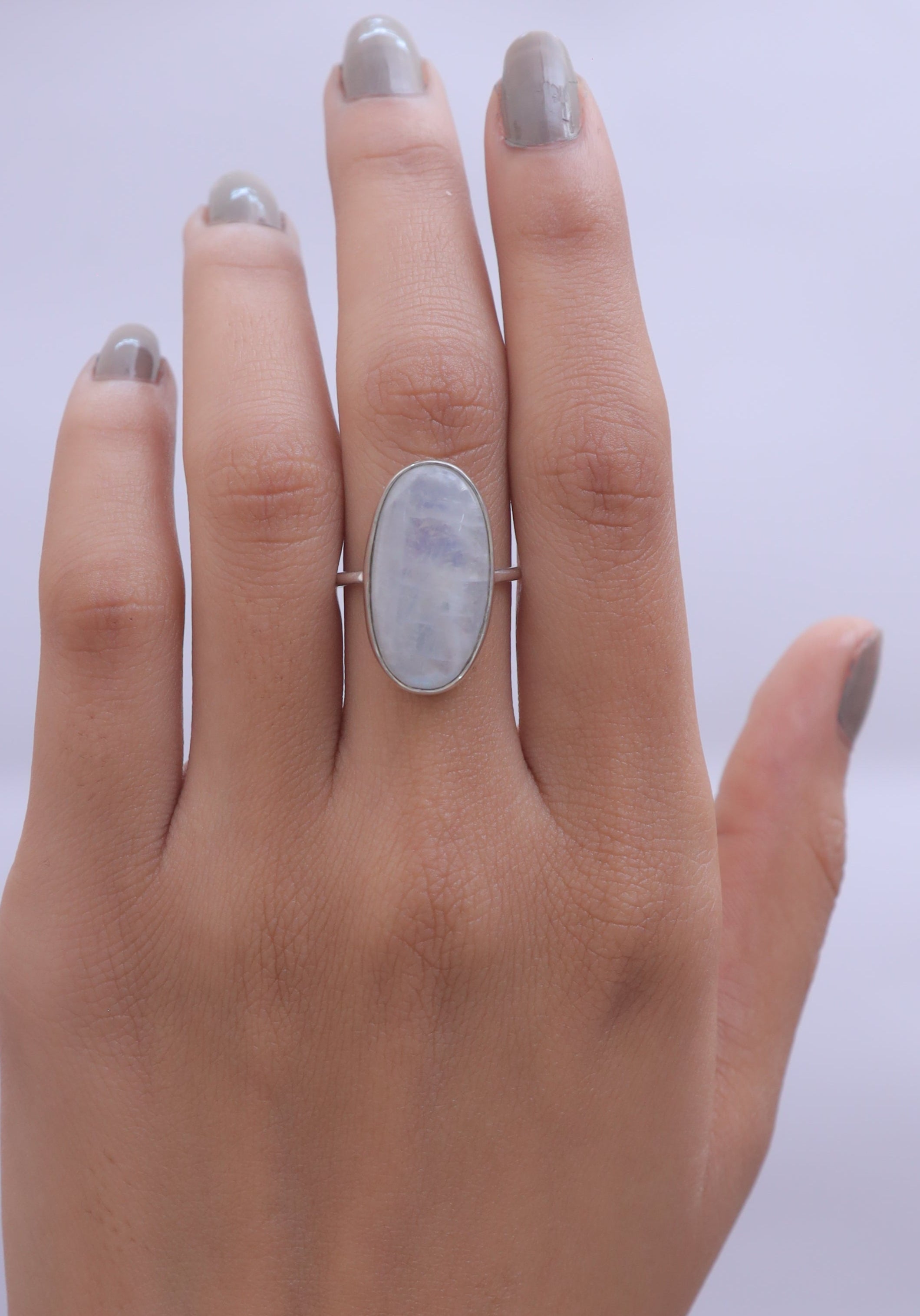 Each detail of the ring showcases expert craftsmanship, from the precisely set prongs securing the Rainbow Moonstone to the polished silver band ensuring a comfortable fit. The design allows the Rainbow Moonstone to shine as the focal point, making it a versatile accessory suitable for everyday wear or special occasions.