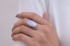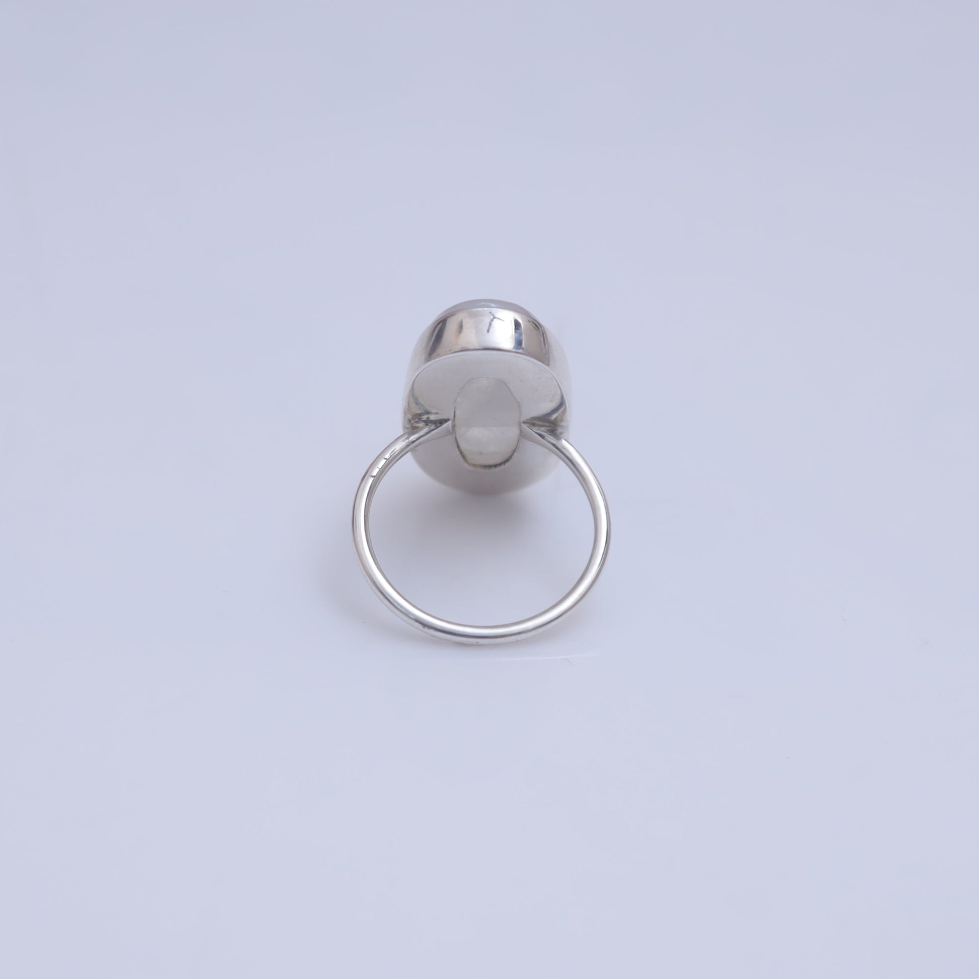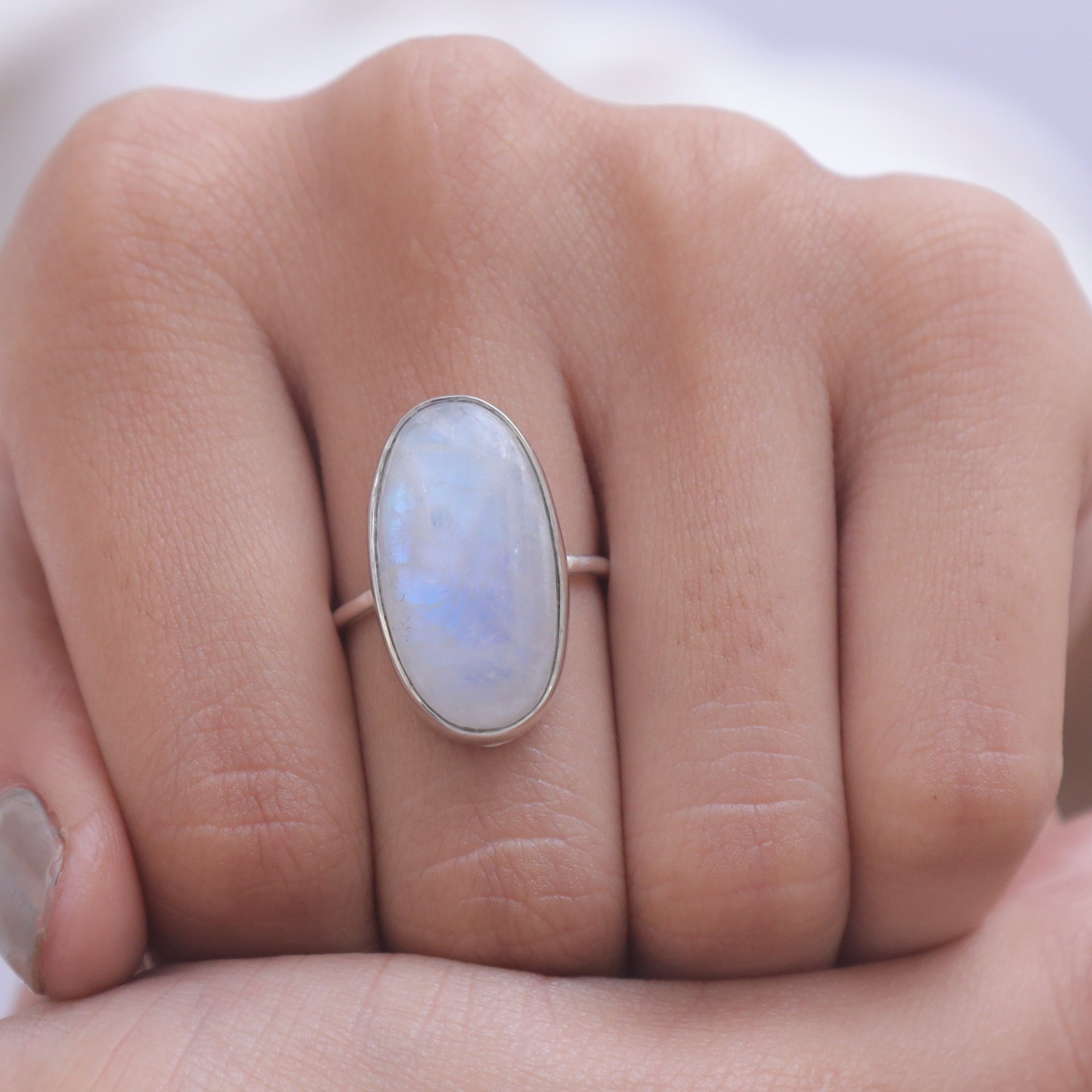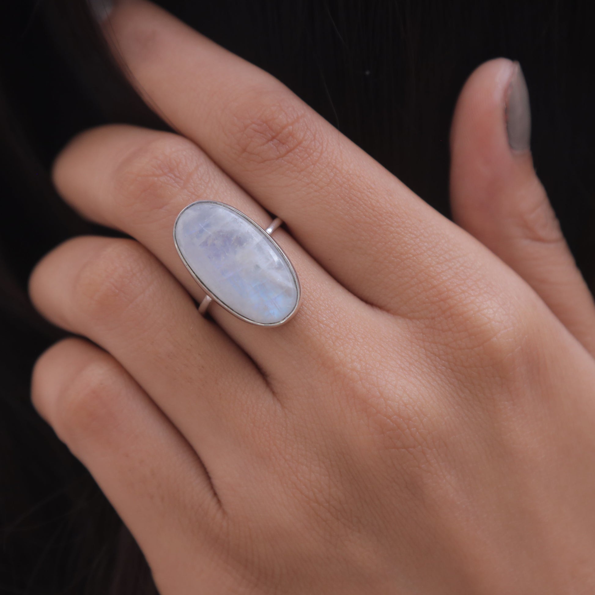 Each detail of the ring showcases expert craftsmanship, from the precisely set prongs securing the Rainbow Moonstone to the polished silver band ensuring a comfortable fit. The design allows the Rainbow Moonstone to shine as the focal point, making it a versatile accessory suitable for everyday wear or special occasions.