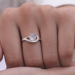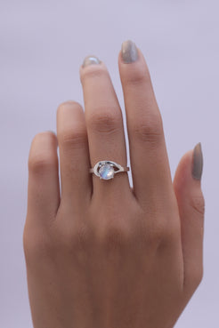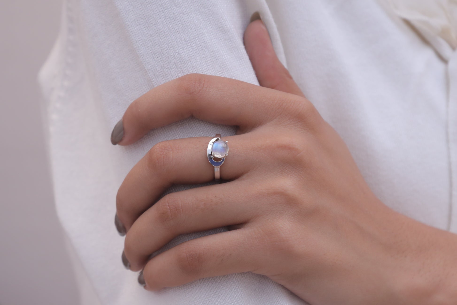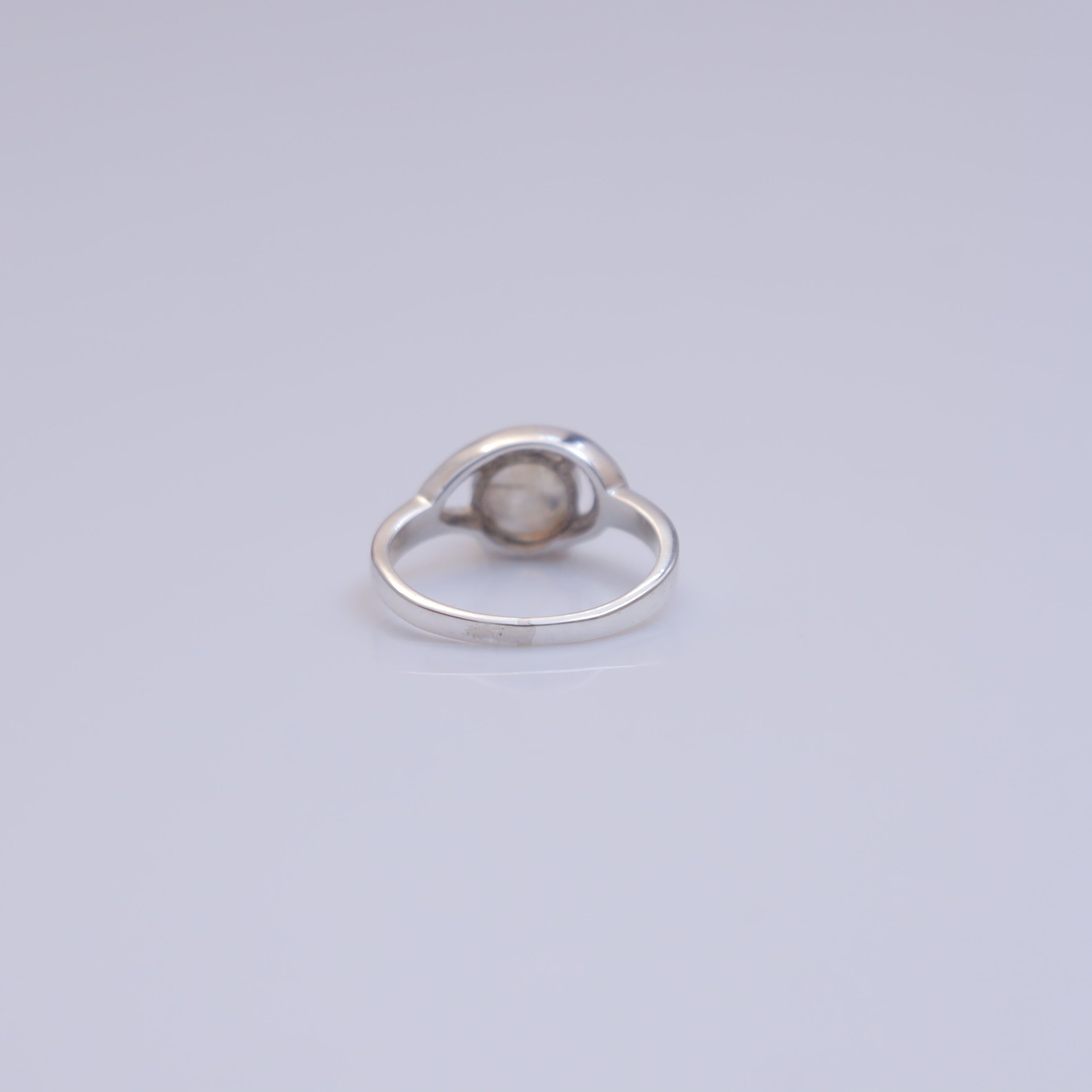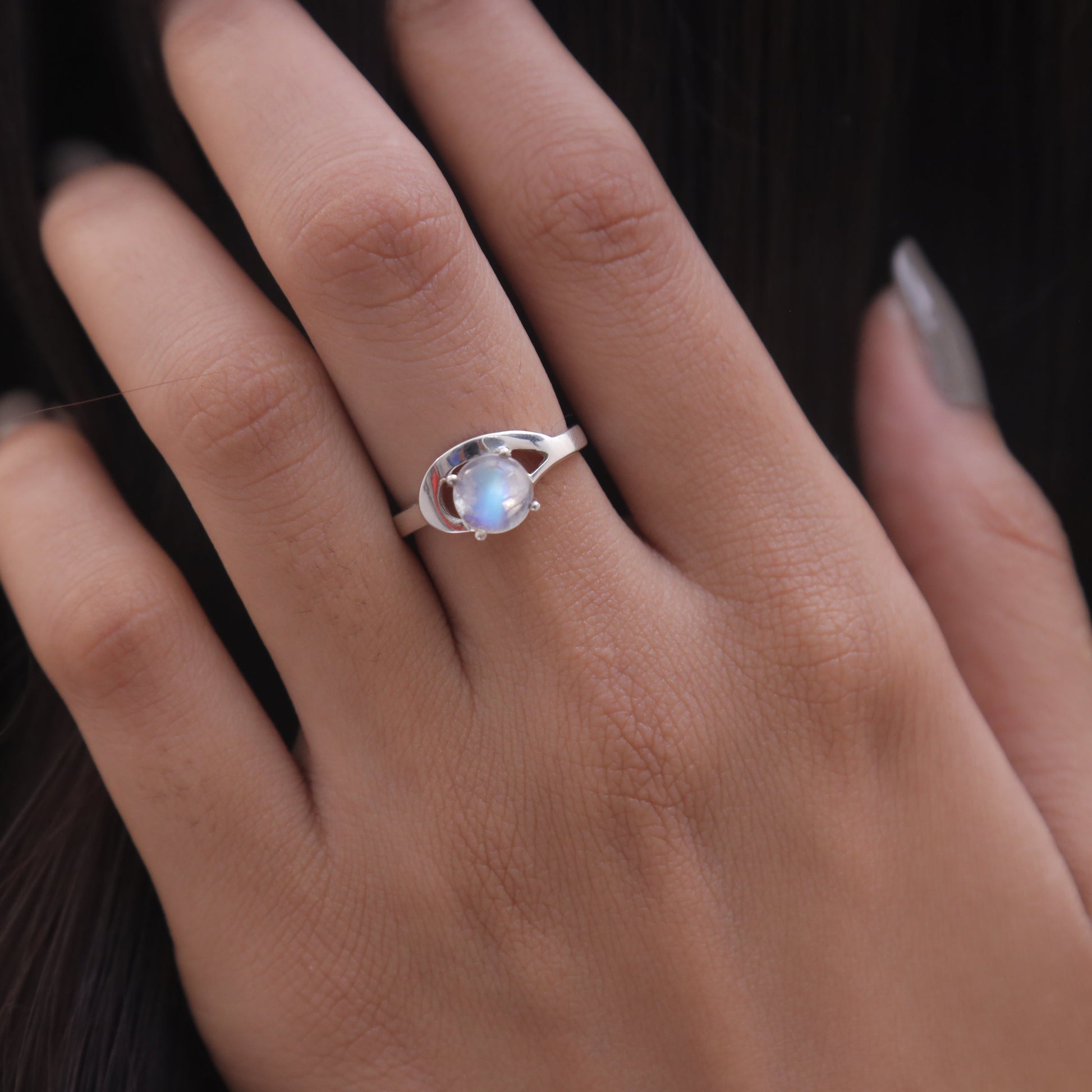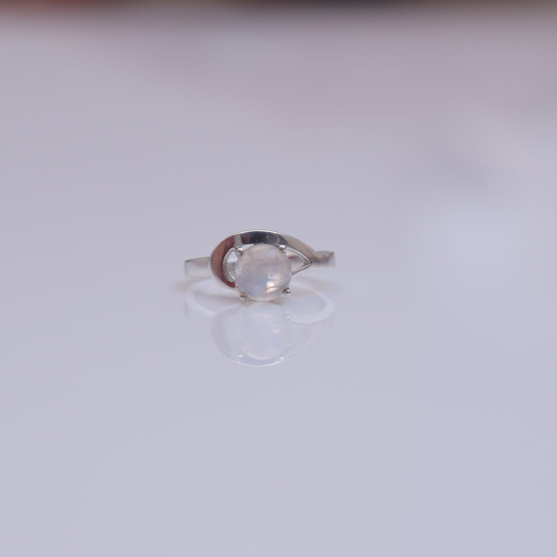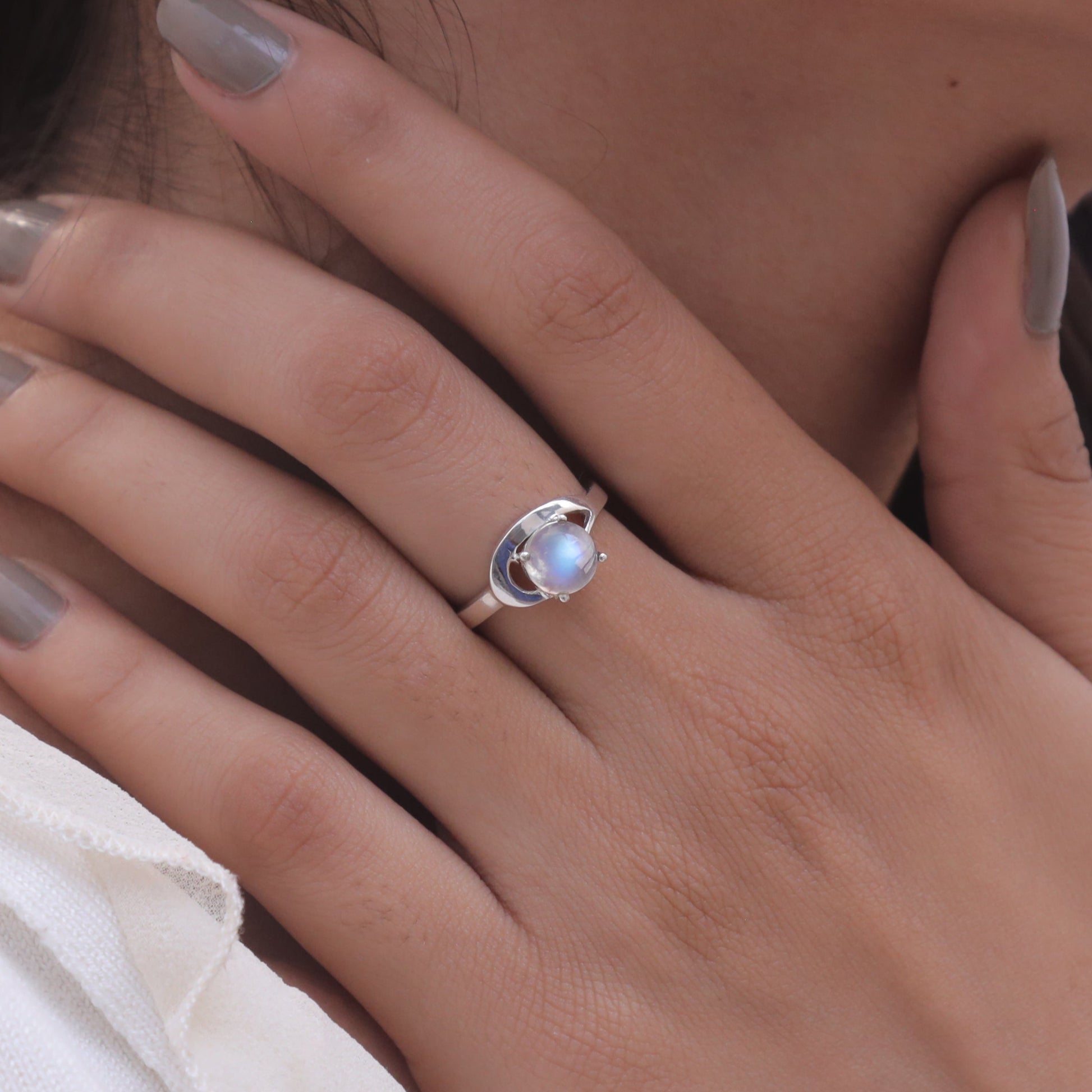 Each detail of the ring showcases expert craftsmanship, from the precisely set prongs securing the Rainbow Moonstone to the polished silver band ensuring a comfortable fit. The design allows the Rainbow Moonstone to shine as the focal point, making it a versatile accessory suitable for everyday wear or special occasions.