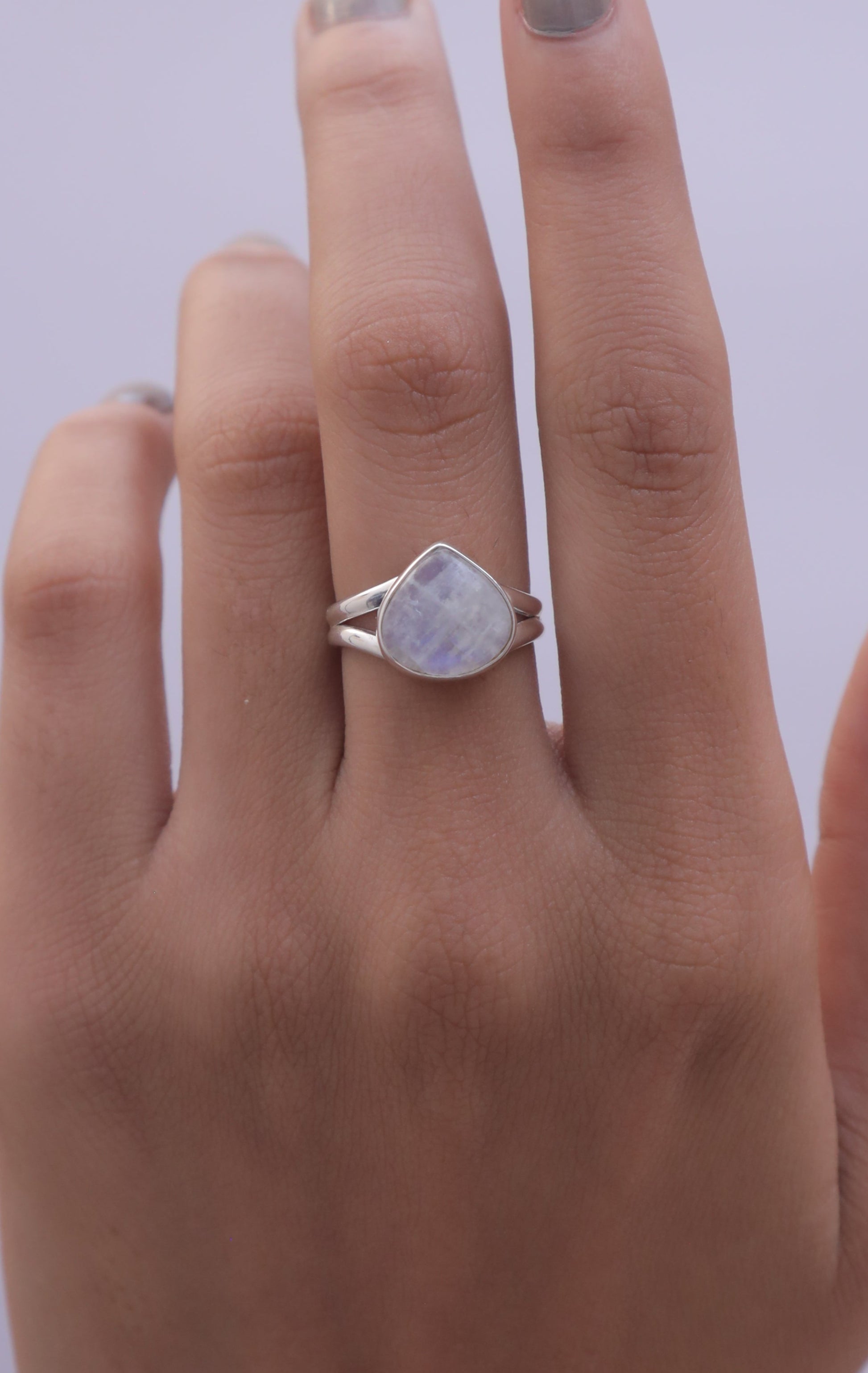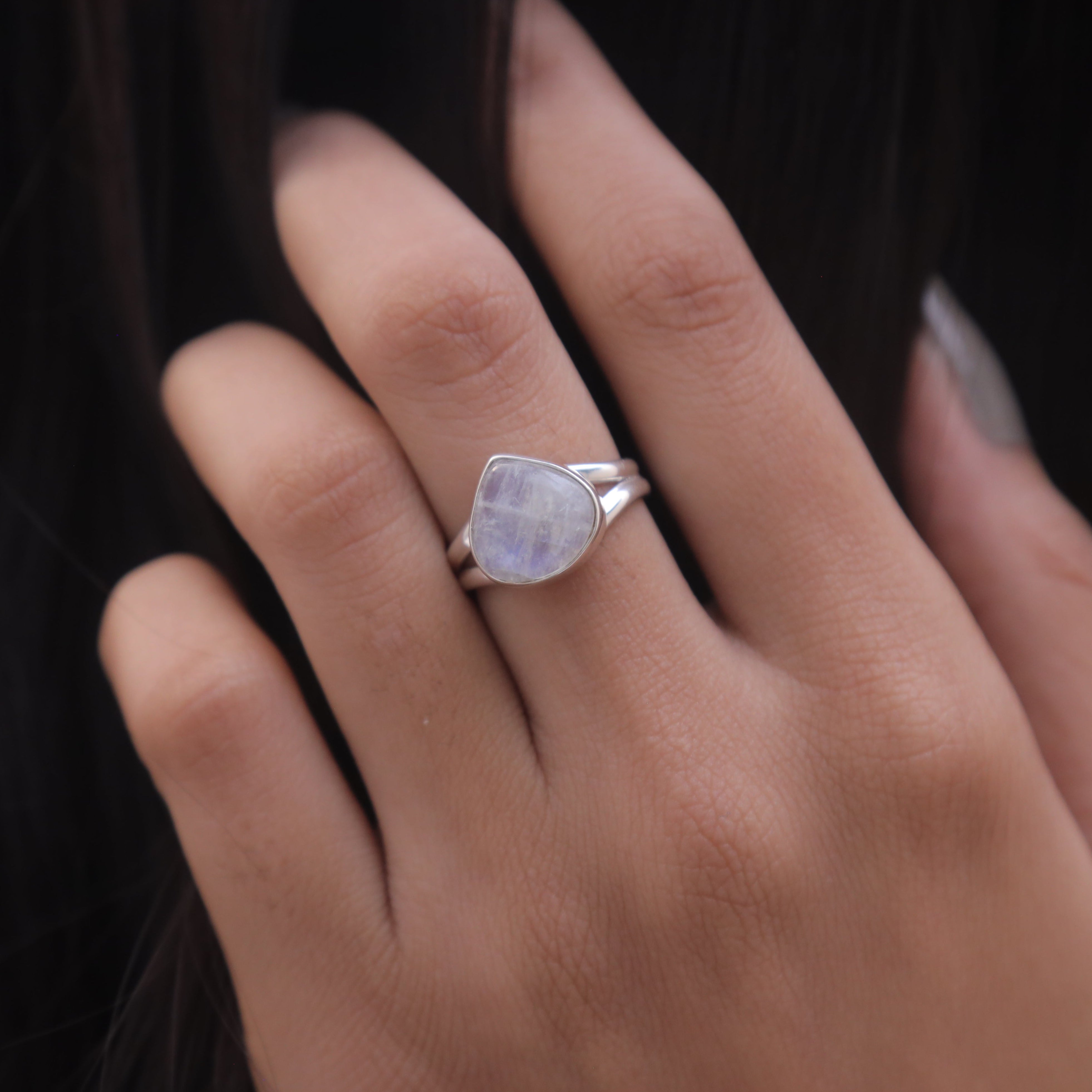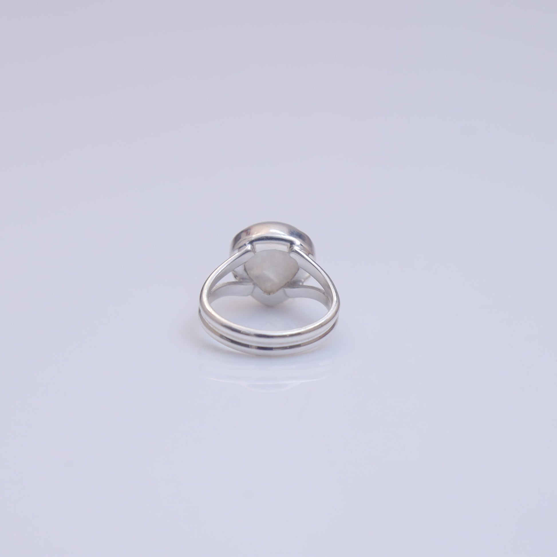 Each detail of the ring showcases expert craftsmanship, from the precisely set prongs securing the Rainbow Moonstone to the polished silver band ensuring a comfortable fit. The design allows the Rainbow Moonstone to shine as the focal point, making it a versatile accessory suitable for everyday wear or special occasions.