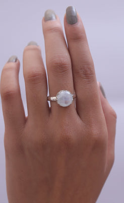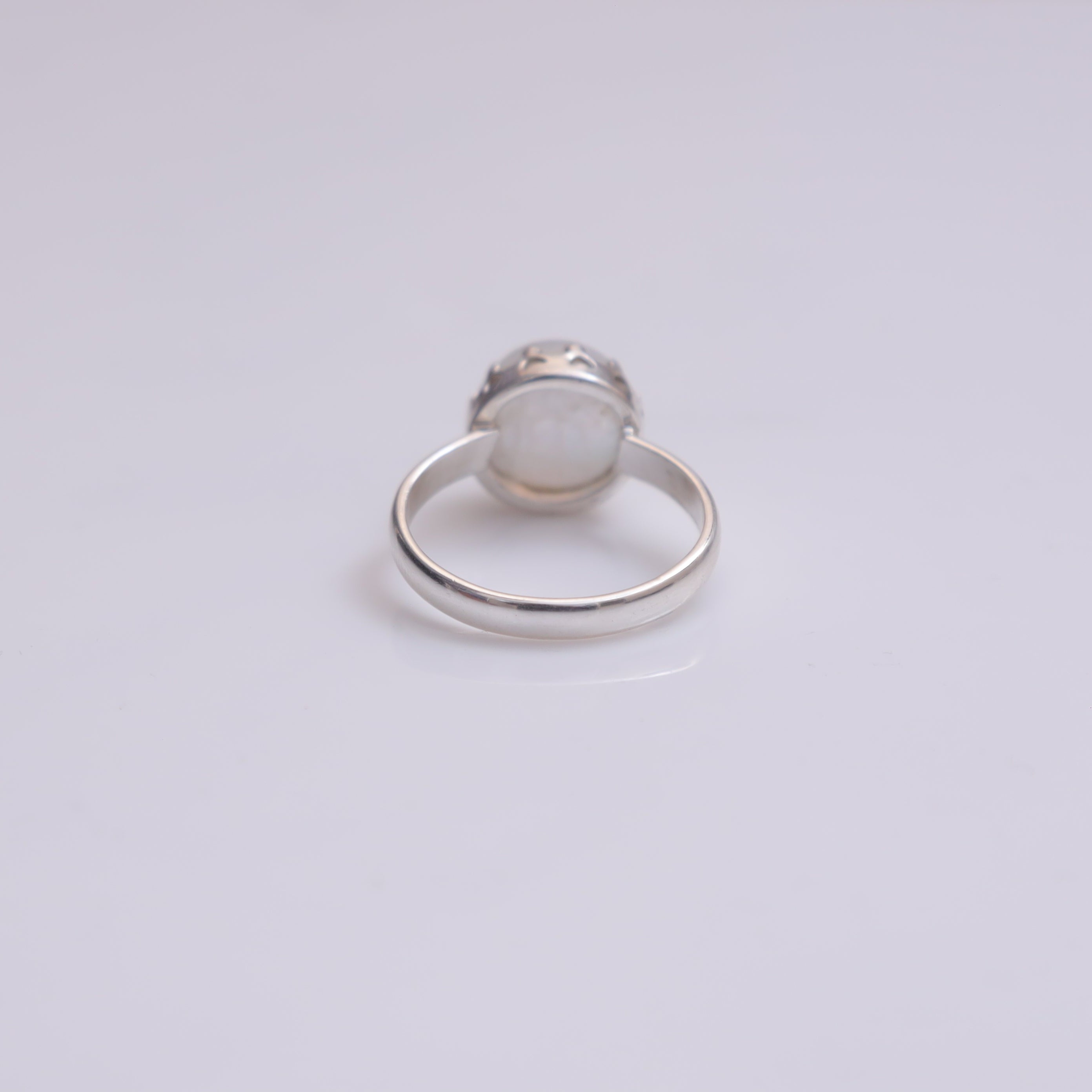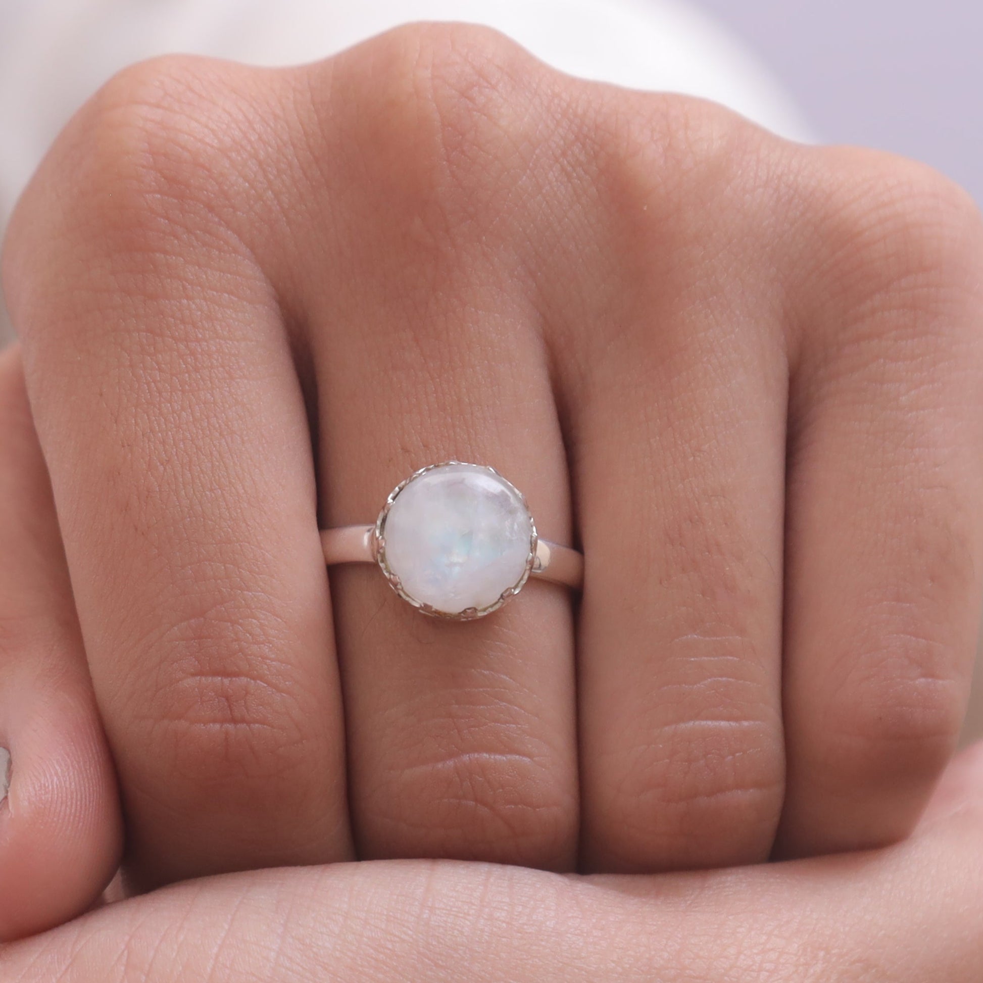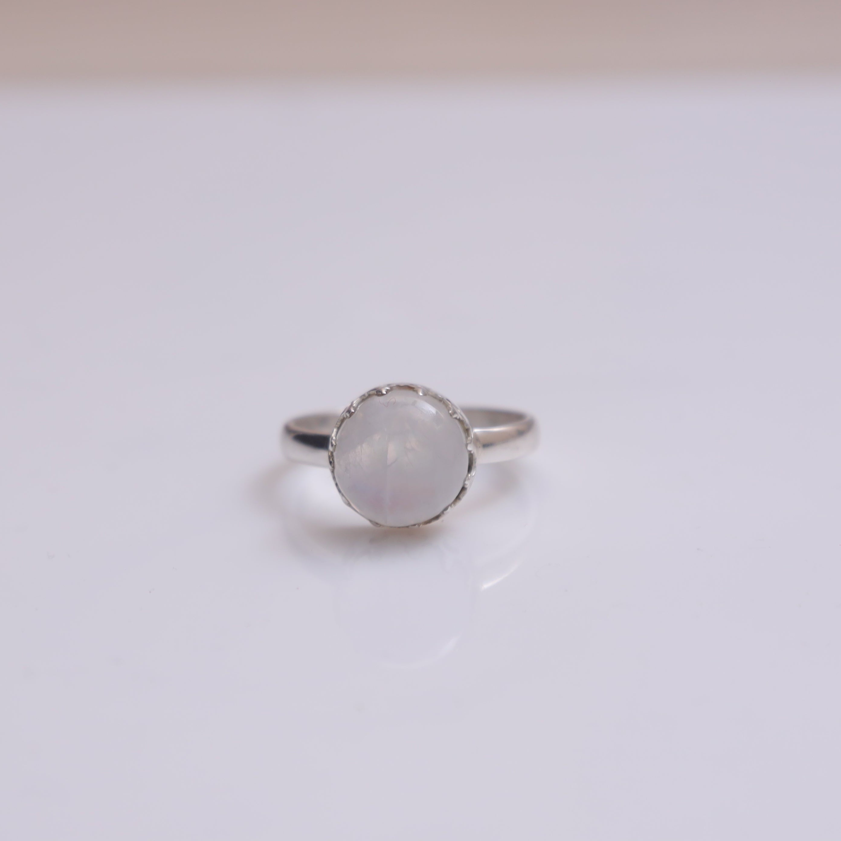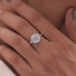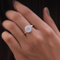 Each detail of the ring showcases expert craftsmanship, from the precisely set prongs securing the Rainbow Moonstone to the polished silver band ensuring a comfortable fit. The design allows the Rainbow Moonstone to shine as the focal point, making it a versatile accessory suitable for everyday wear or special occasions.