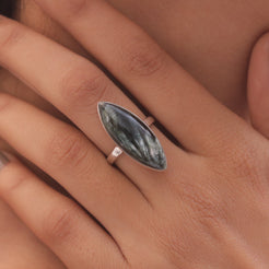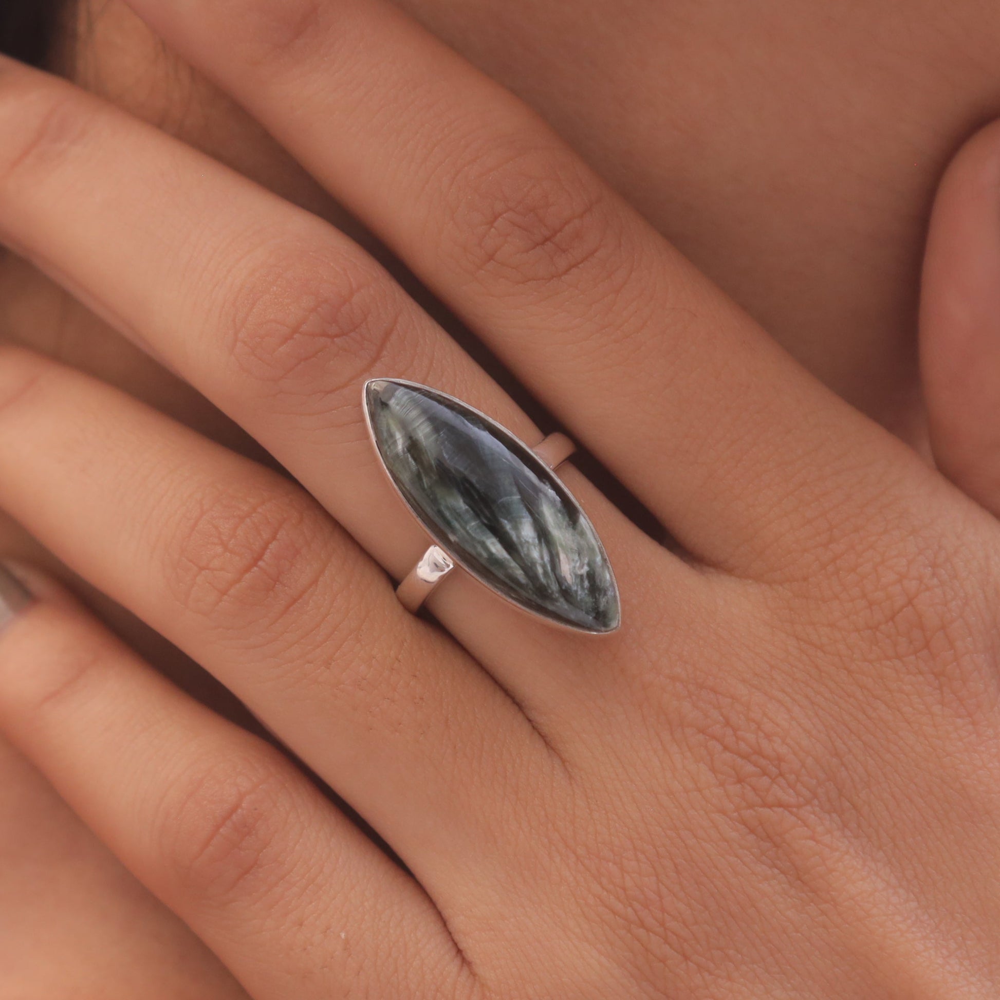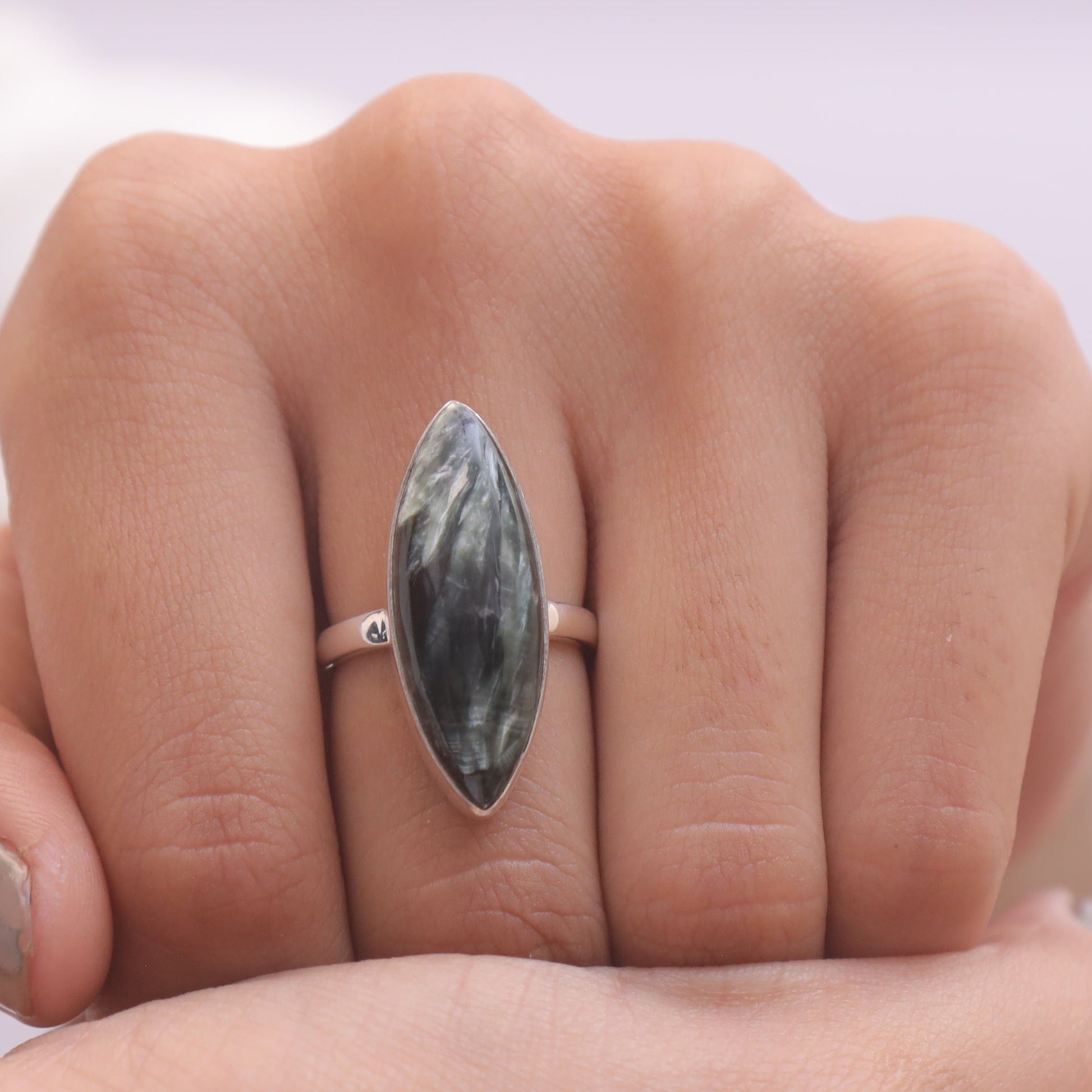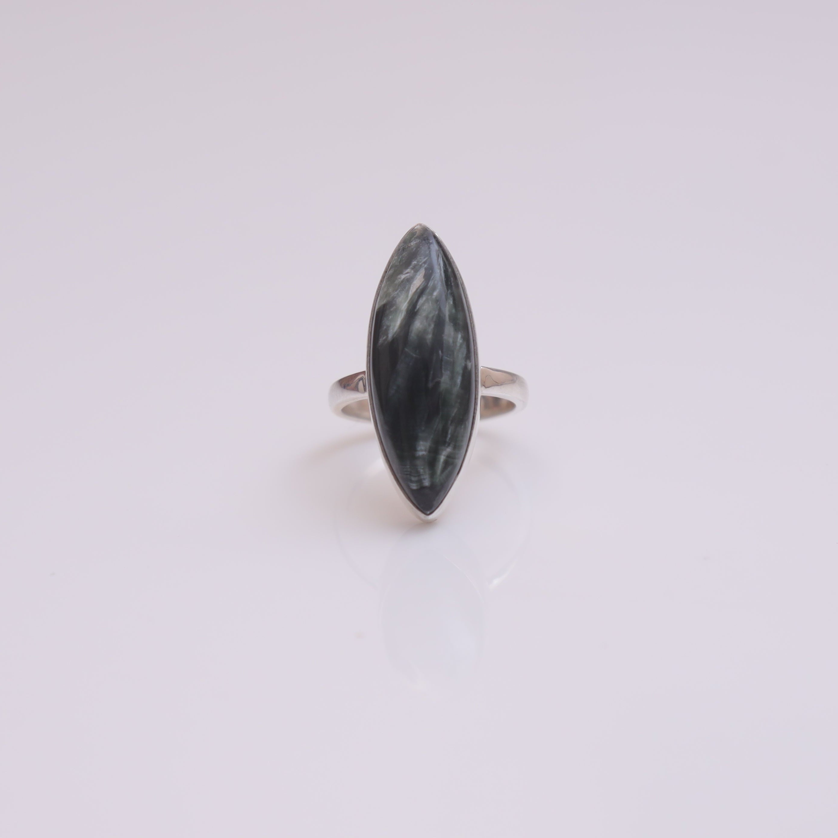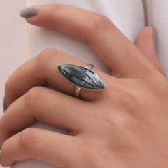 Elevate your style with the Seraphinite Sterling Silver Ring, a testament to blending natural beauty with refined craftsmanship. Each ring features a radiant Seraphinite gemstone, carefully cut to enhance its inherent allure and brilliance. Set in 925 sterling silver, these rings offer durability and a lasting shine that complements the gemstone's vibrant hue.