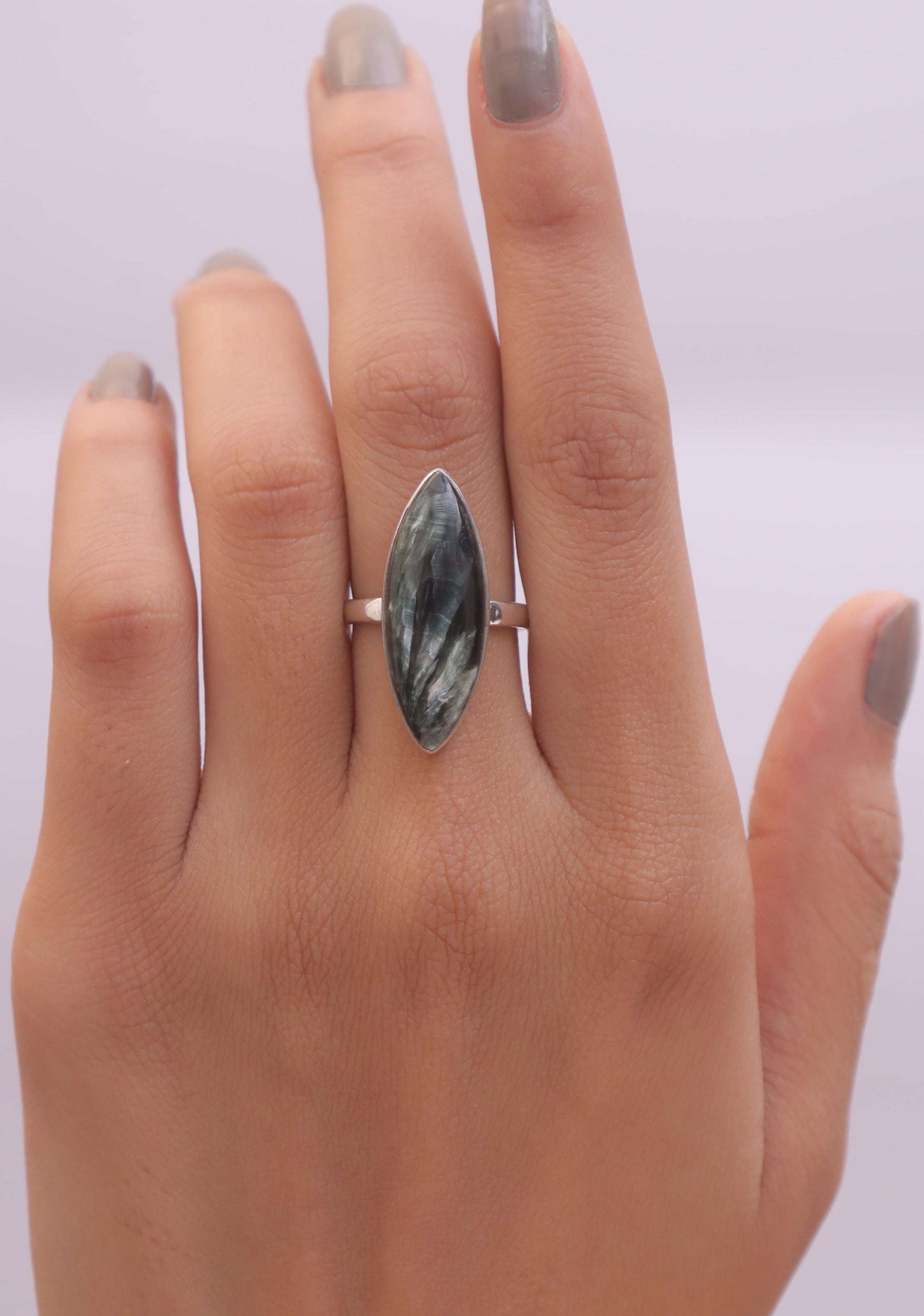 Crafted with precision, the Seraphinite is securely held by polished prongs, allowing it to shine as the focal point of each ring. The design ensures comfort and a perfect fit, making these rings versatile for everyday wear or special occasions.