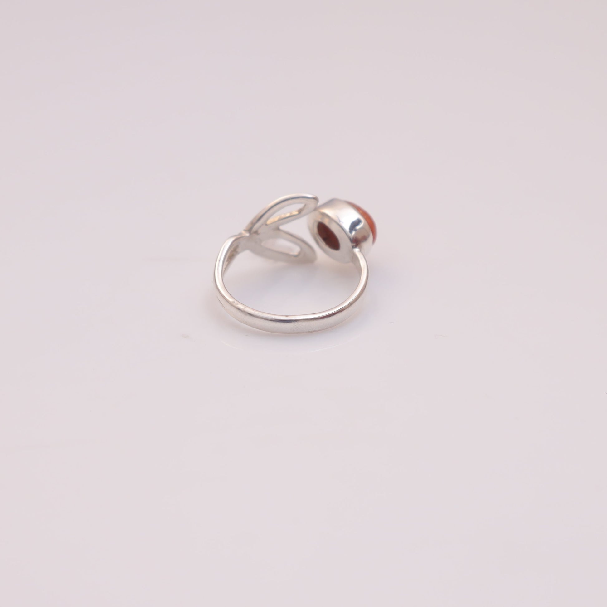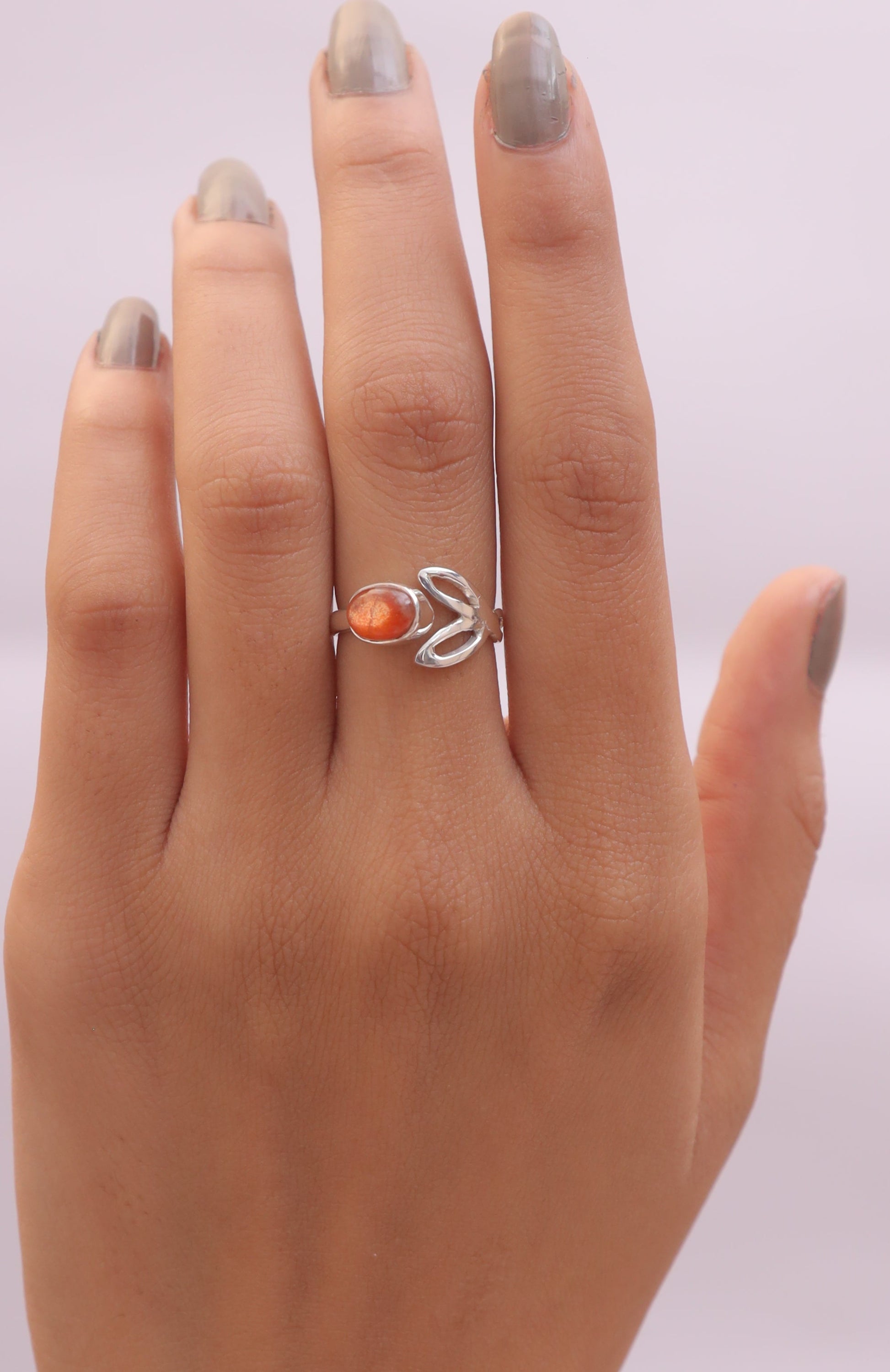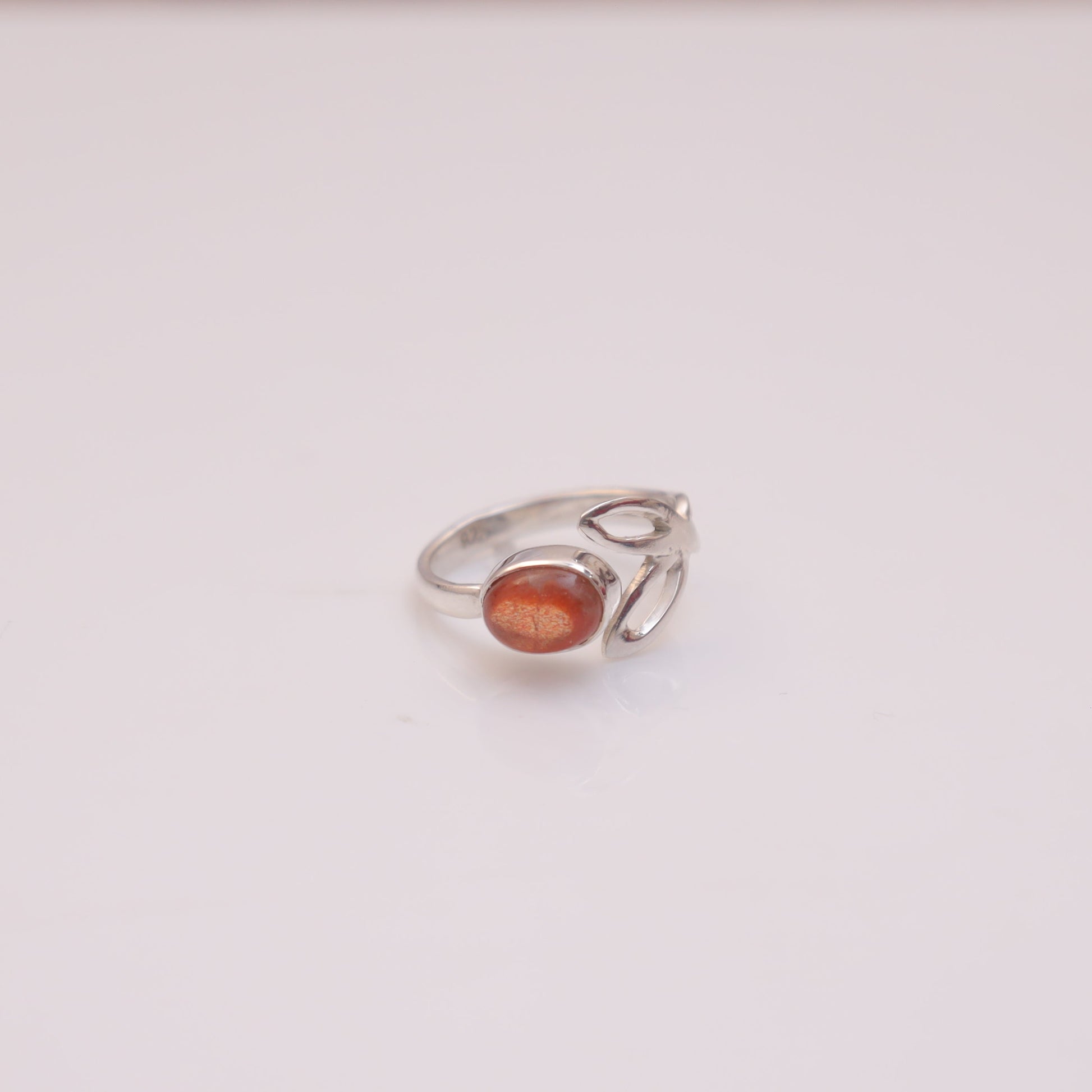 Each detail of the ring showcases expert craftsmanship, from the precisely set prongs securing the Sunstone to the polished silver band ensuring a comfortable fit. The design allows the Sunstone to shine as the focal point, making it a versatile accessory suitable for everyday wear or special occasions.
