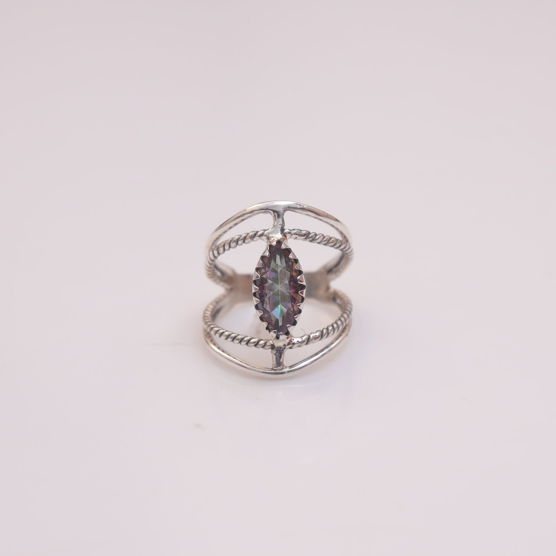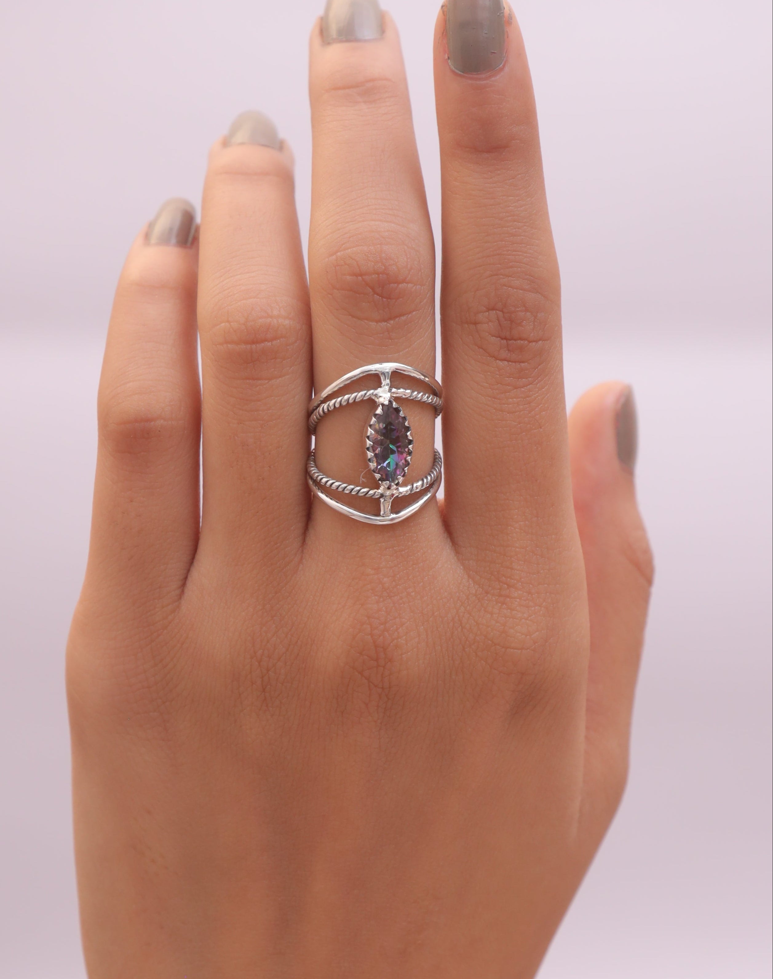 Each detail of the ring showcases expert craftsmanship, from the precisely set prongs securing the Mystic Topaz to the polished silver band ensuring a comfortable fit. The design allows the Mystic Topaz to shine as the focal point, making it a versatile accessory suitable for everyday wear or special occasions.