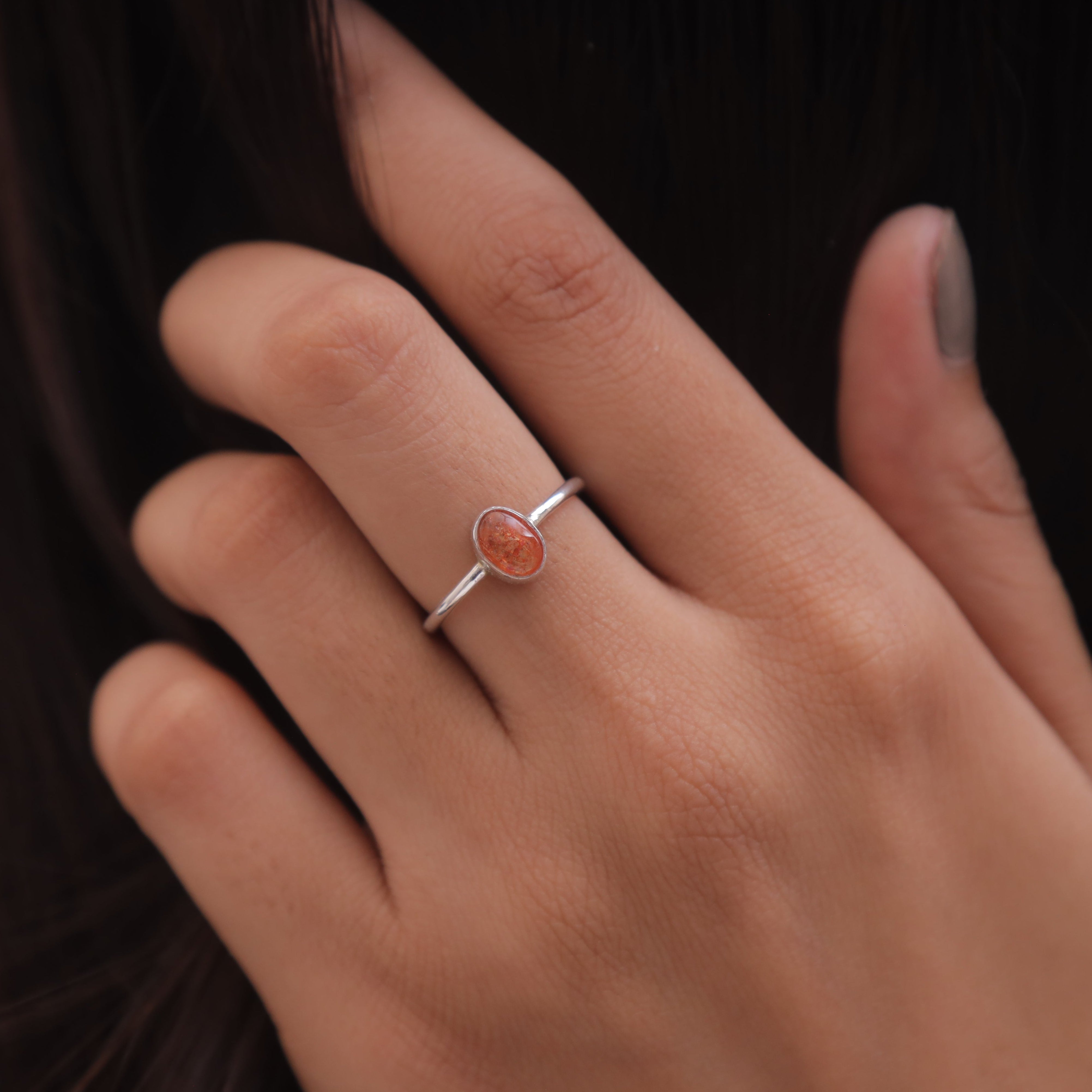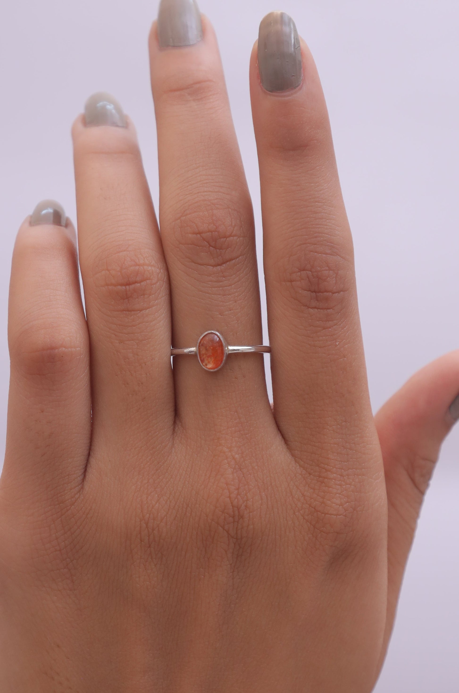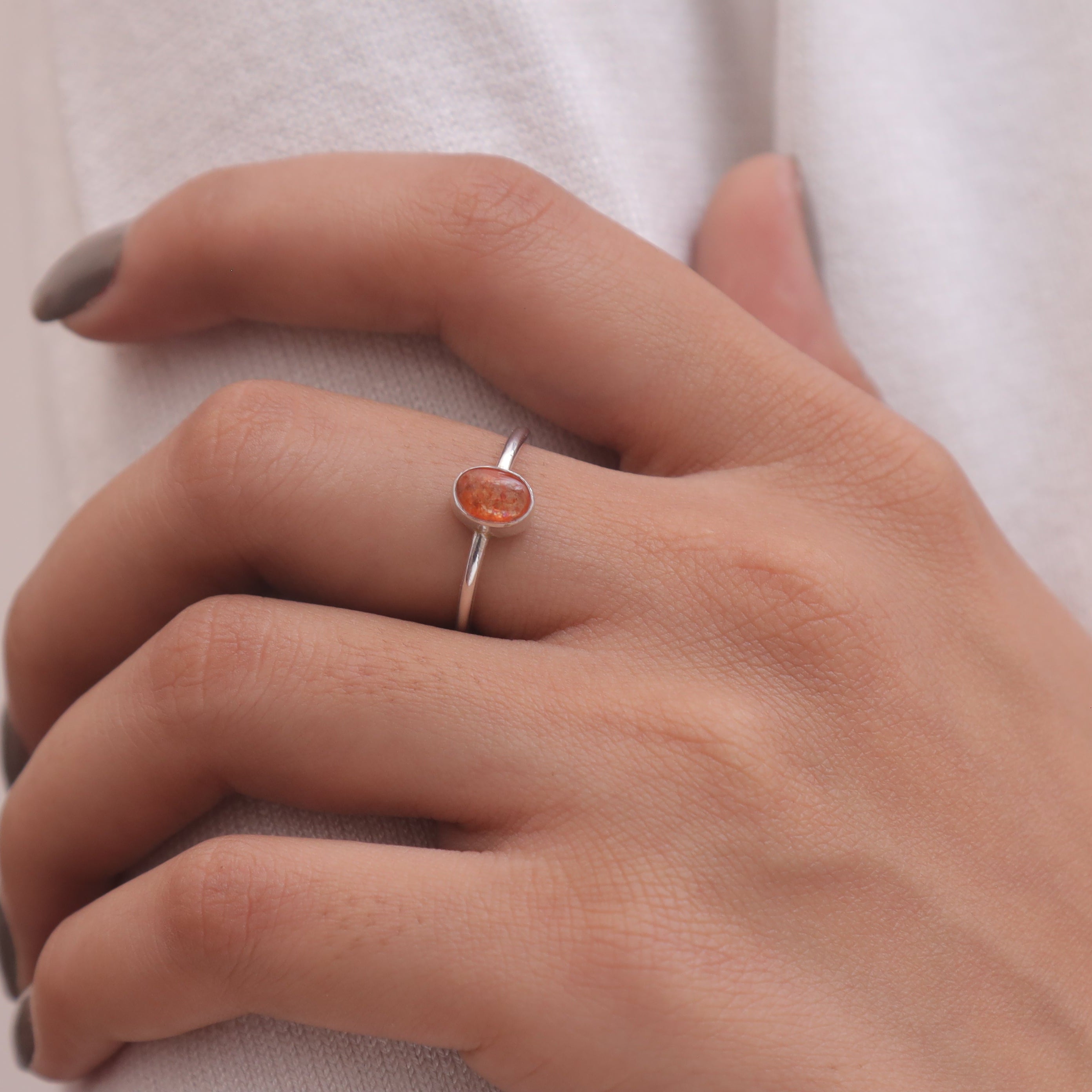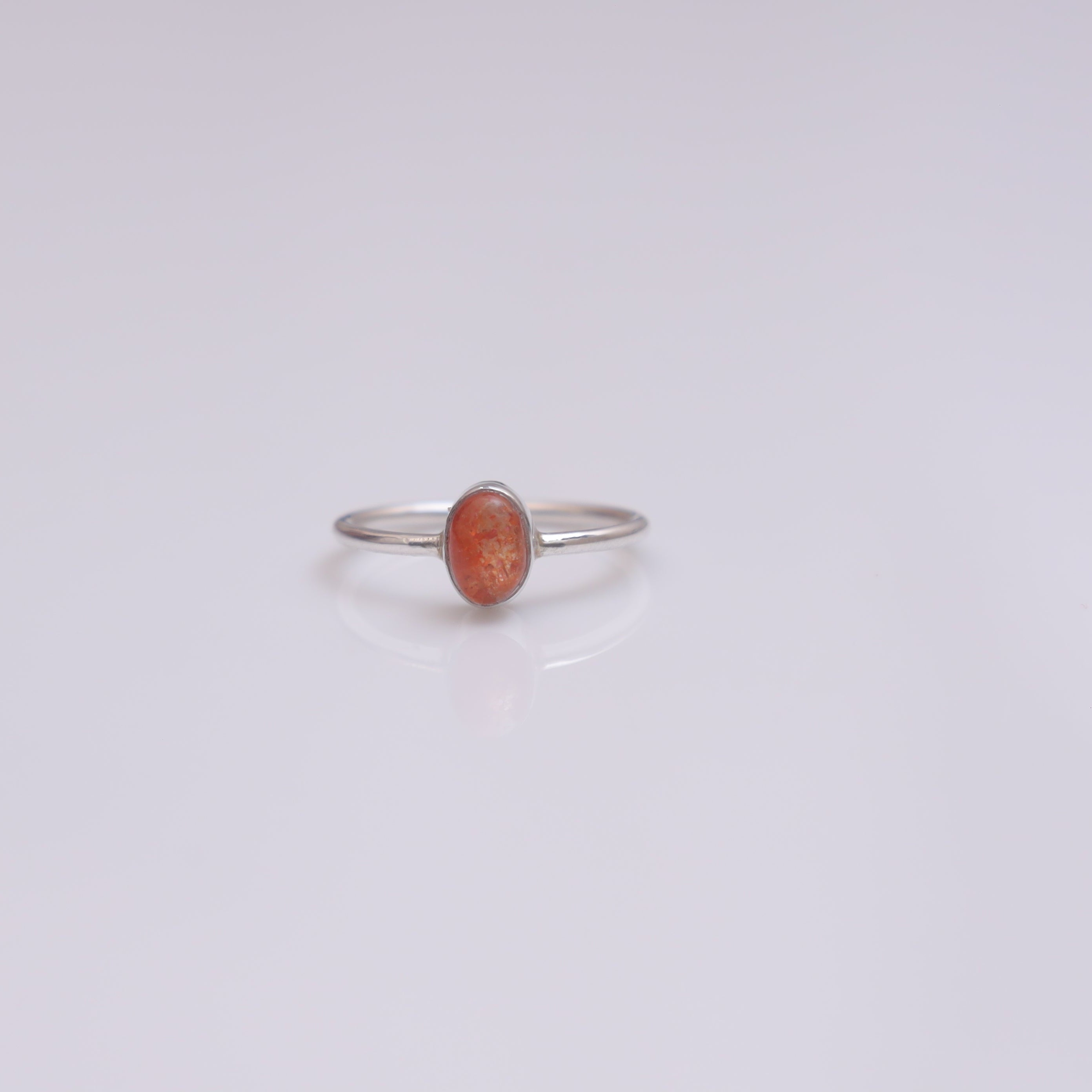 Each detail of the ring showcases expert craftsmanship, from the precisely set prongs securing the Sunstone to the polished silver band ensuring a comfortable fit. The design allows the Sunstone to shine as the focal point, making it a versatile accessory suitable for everyday wear or special occasions.