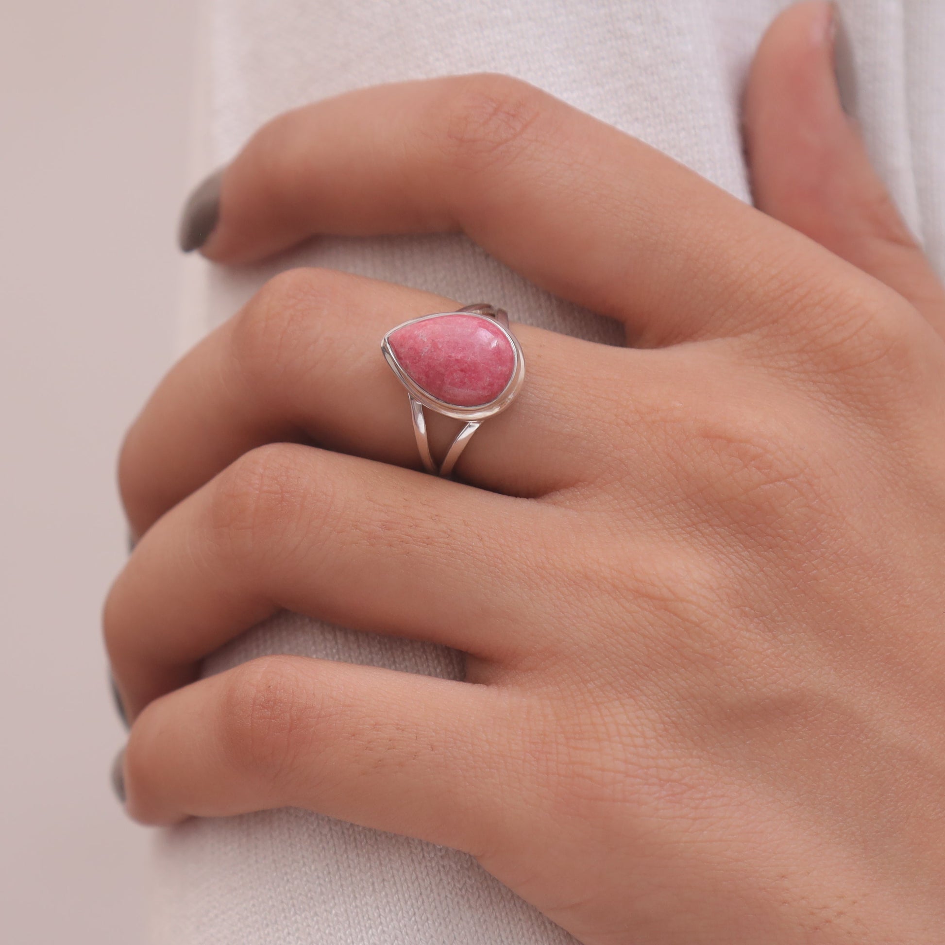 Each detail of the ring showcases expert craftsmanship, from the precisely set prongs securing the Thulite to the polished silver band ensuring a comfortable fit. The design allows the Thulite to shine as the focal point, making it a versatile accessory suitable for everyday wear or special occasions.