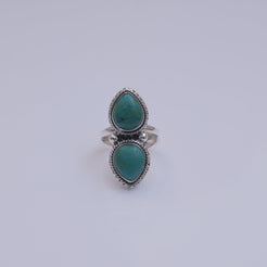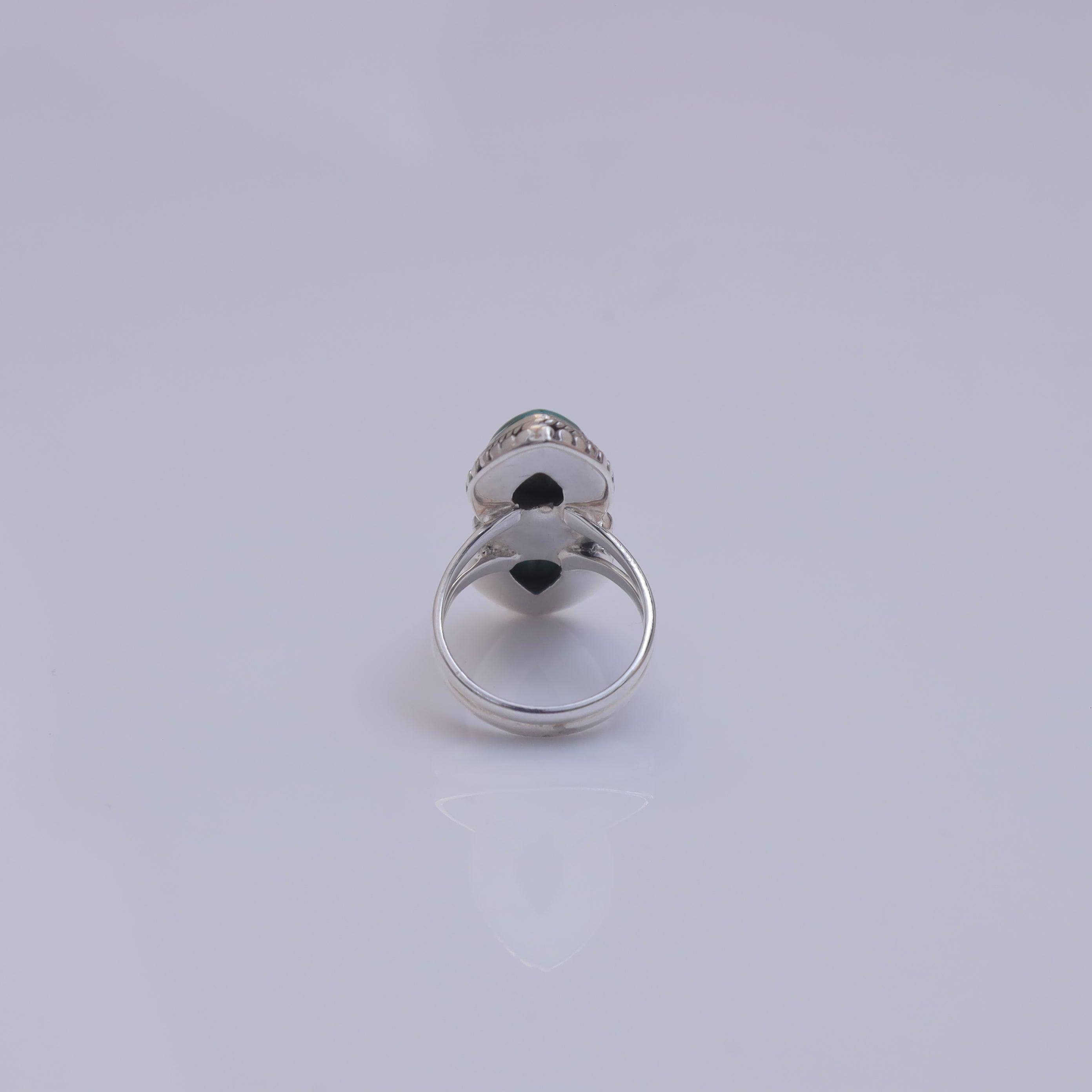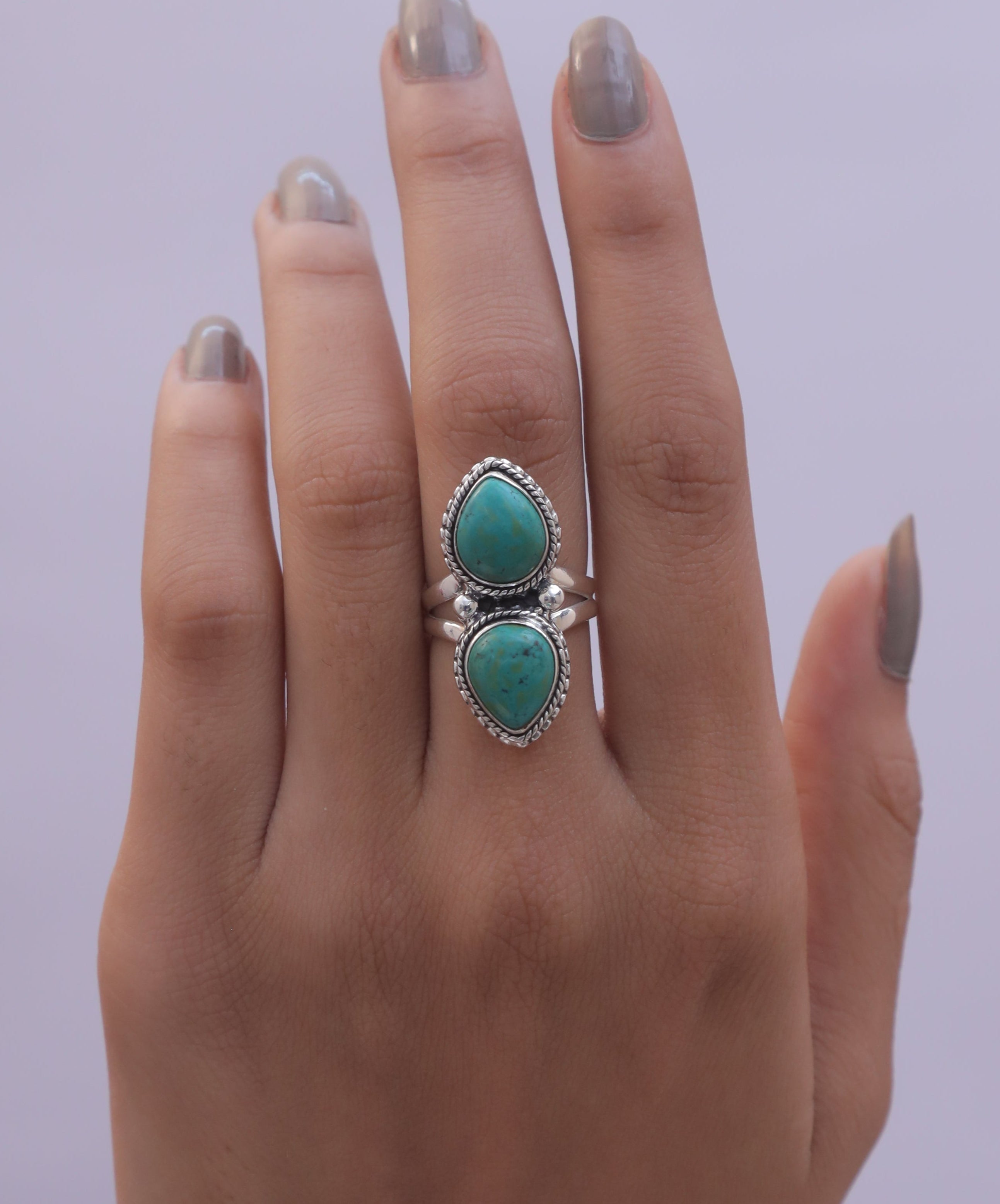Each detail of the ring showcases expert craftsmanship, from the precisely set prongs securing the Tibetan Turquoise to the polished silver band ensuring a comfortable fit. The design allows the Tibetan Turquoise to shine as the focal point, making it a versatile accessory suitable for everyday wear or special occasions.