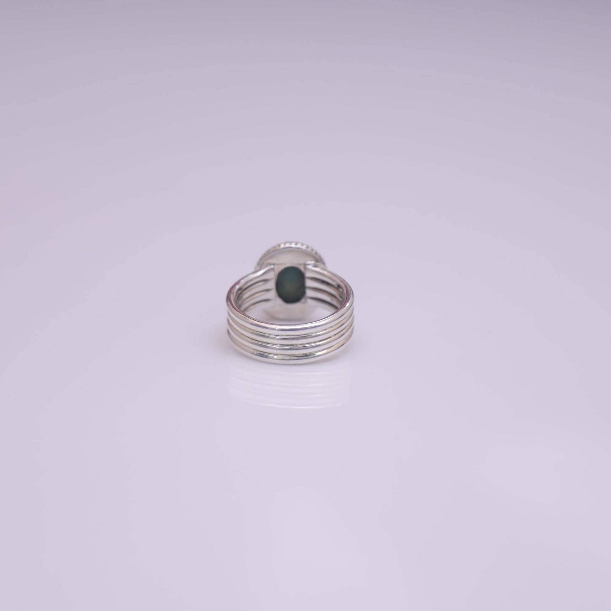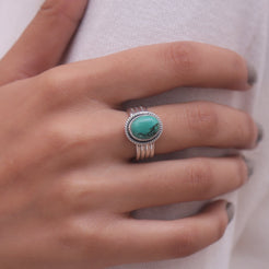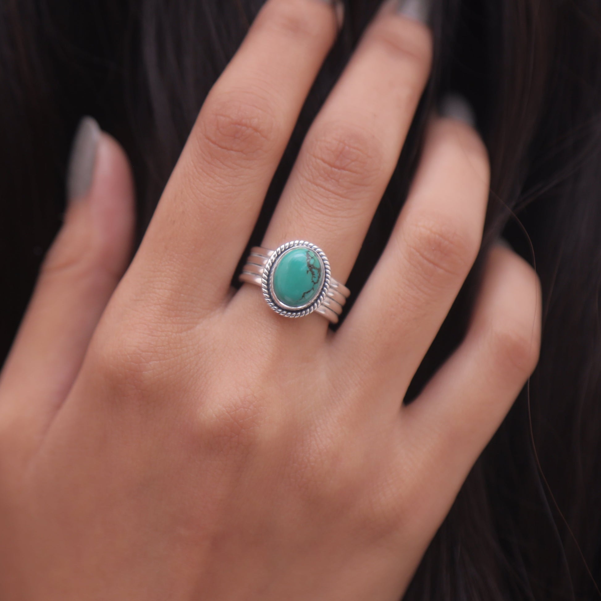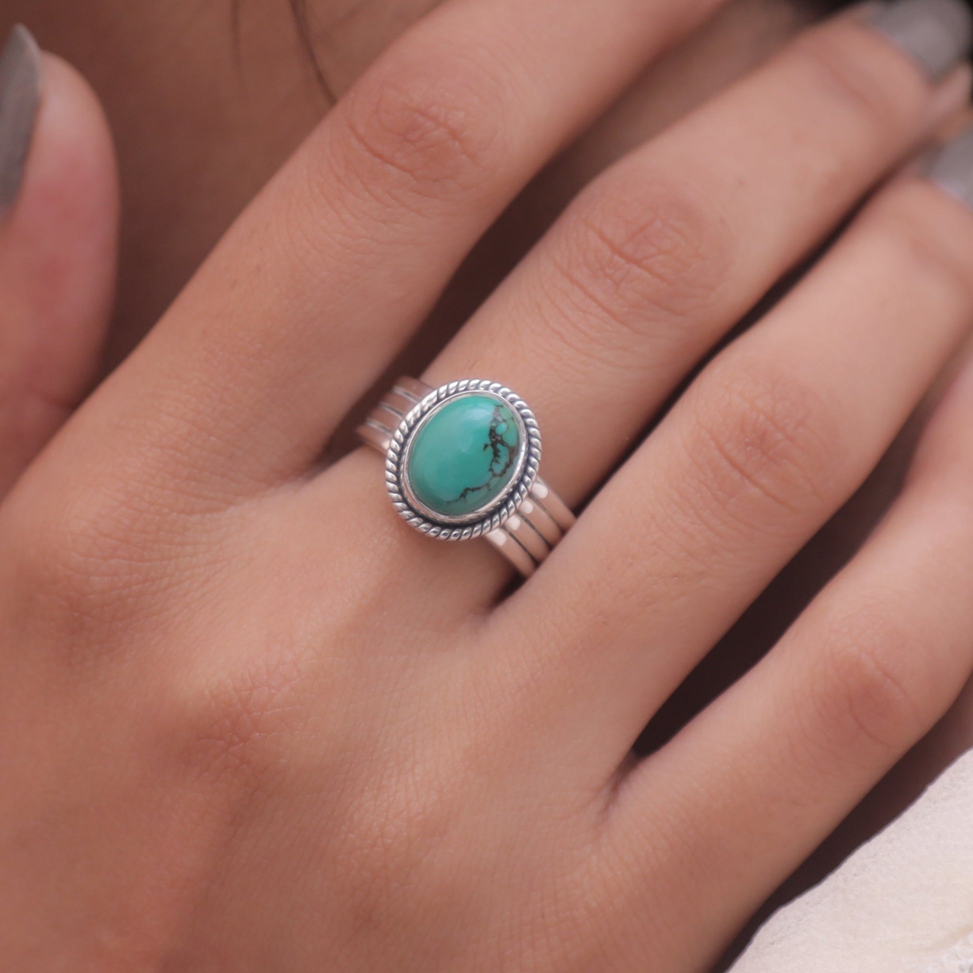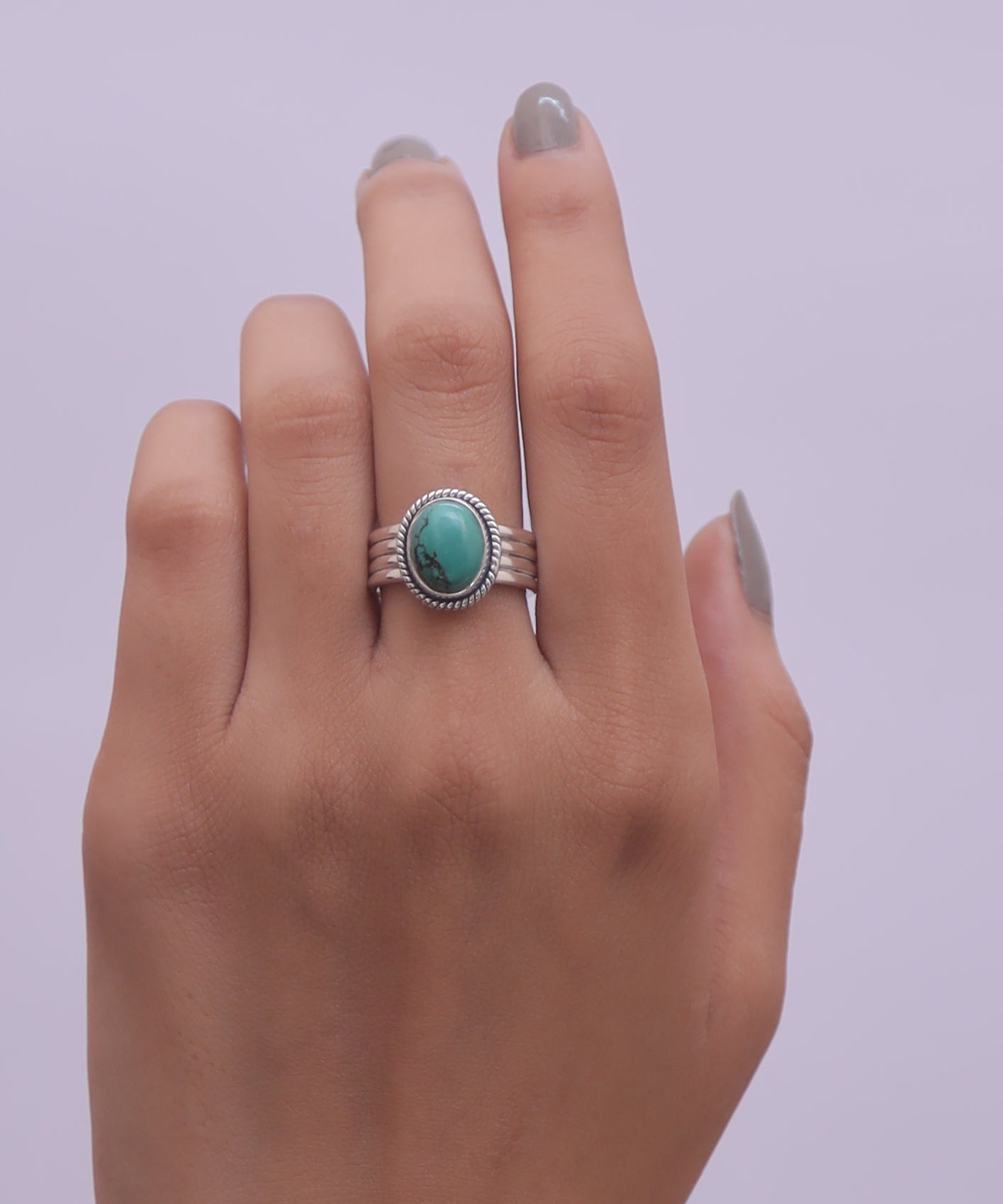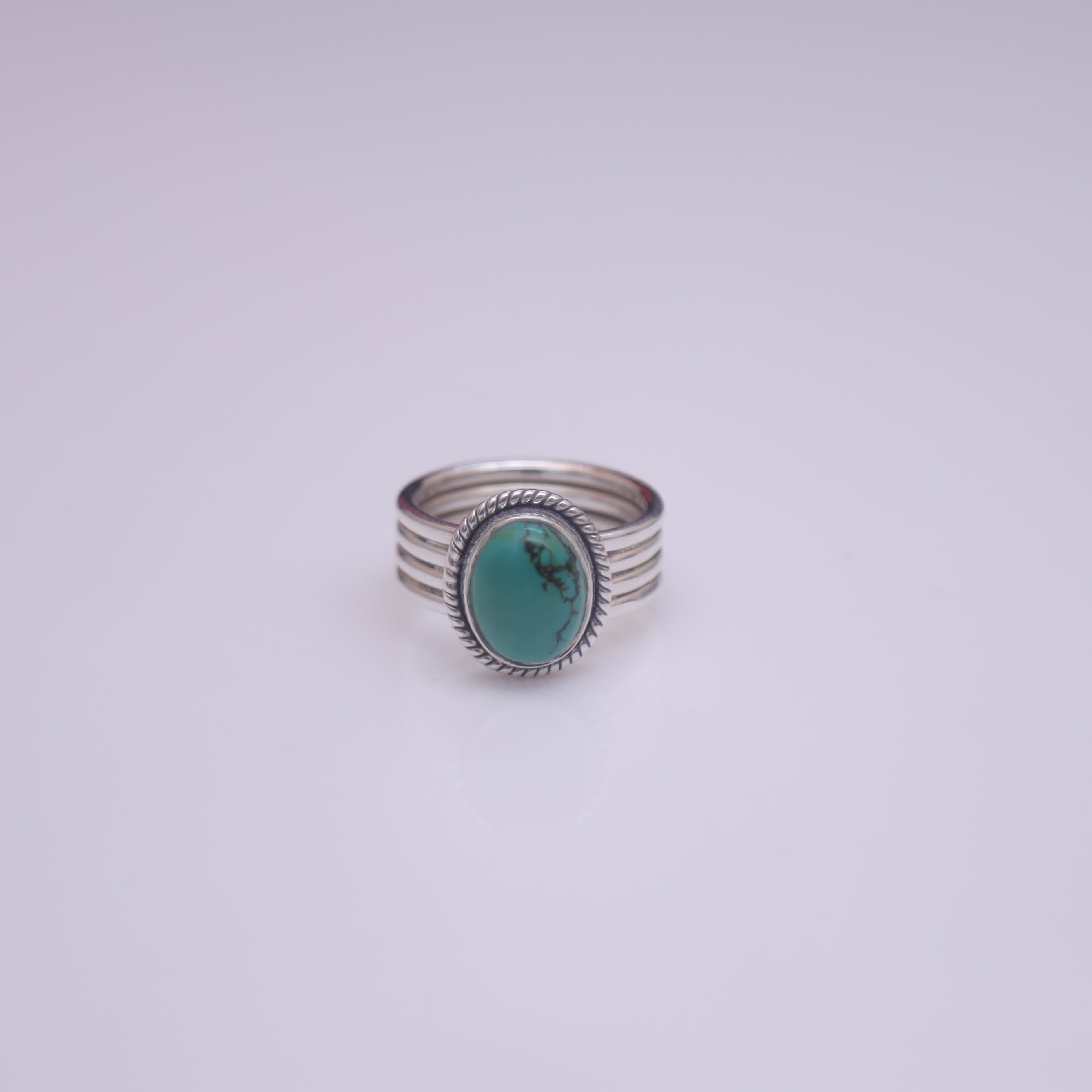 Each detail of the ring showcases expert craftsmanship, from the precisely set prongs securing the Tibetan Turquoise to the polished silver band ensuring a comfortable fit. The design allows the Tibetan Turquoise to shine as the focal point, making it a versatile accessory suitable for everyday wear or special occasions.