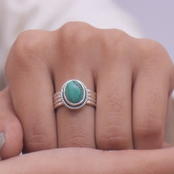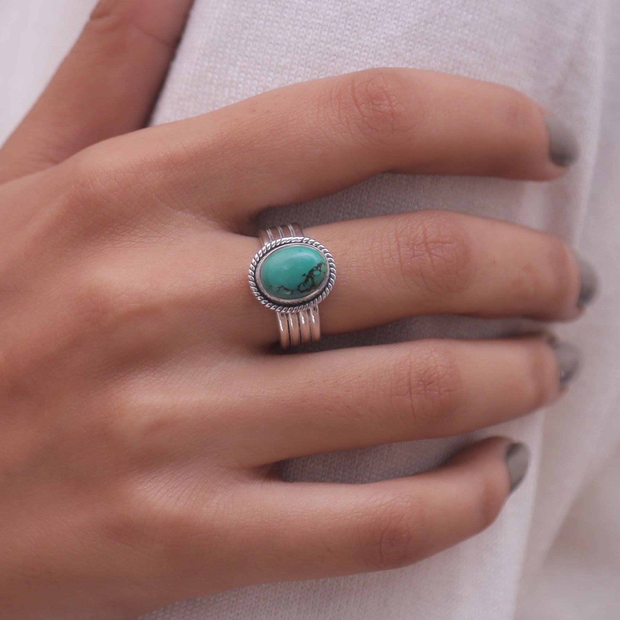 Elevate your style with the Tibetan Turquoise Ring, a masterpiece that blends natural beauty with refined craftsmanship. The ring features a radiant Tibetan Turquoise centrepiece, carefully cut to enhance its inherent allure and brilliance. Set in a band crafted from 925 sterling silver, it offers durability and a lasting shine that complements the gemstone's vibrant hue.