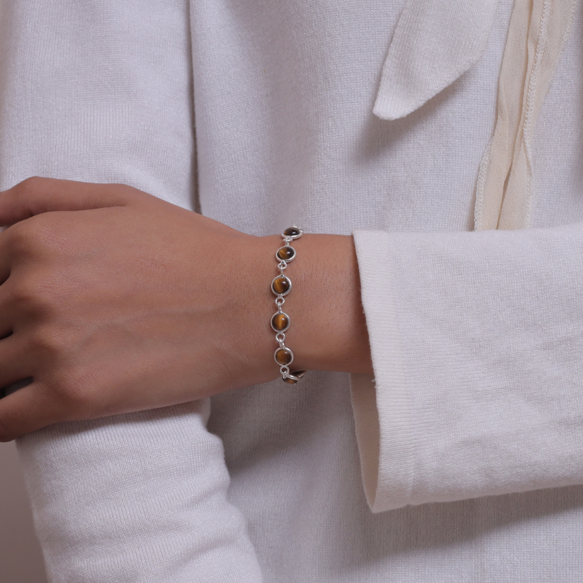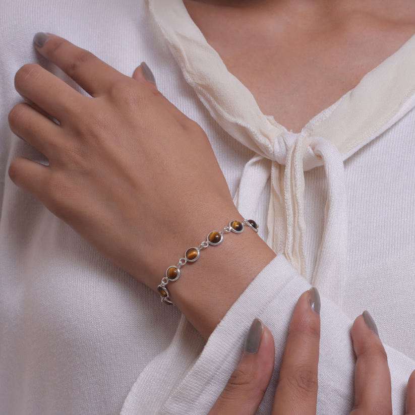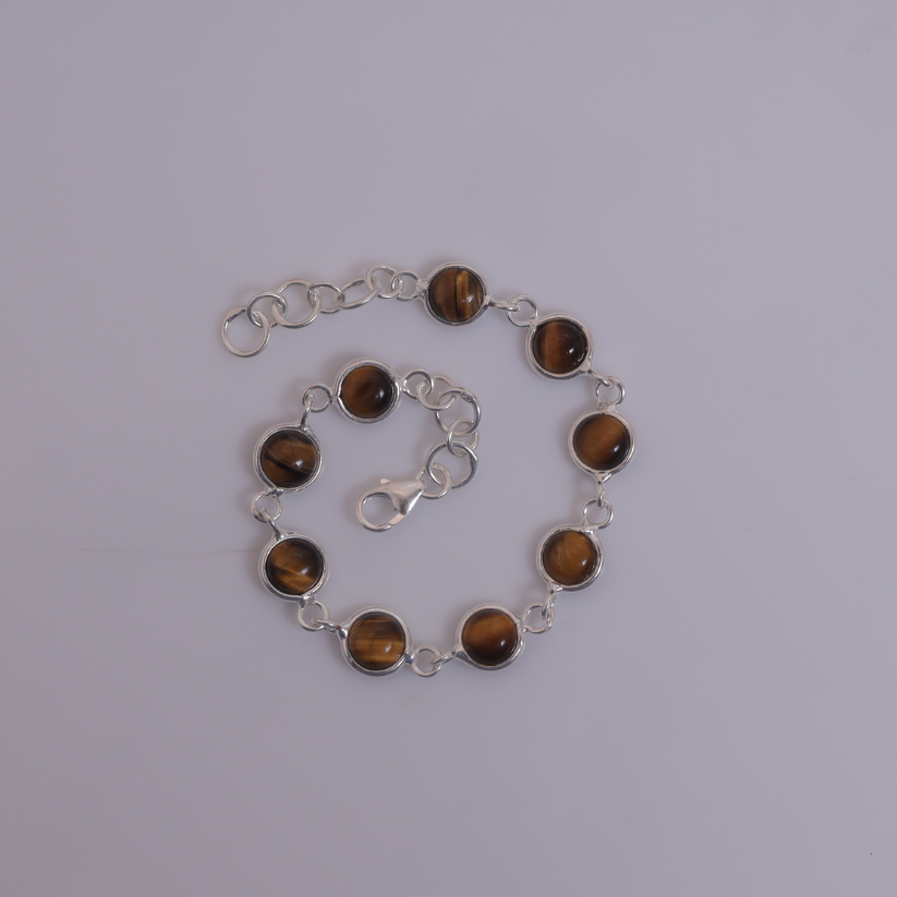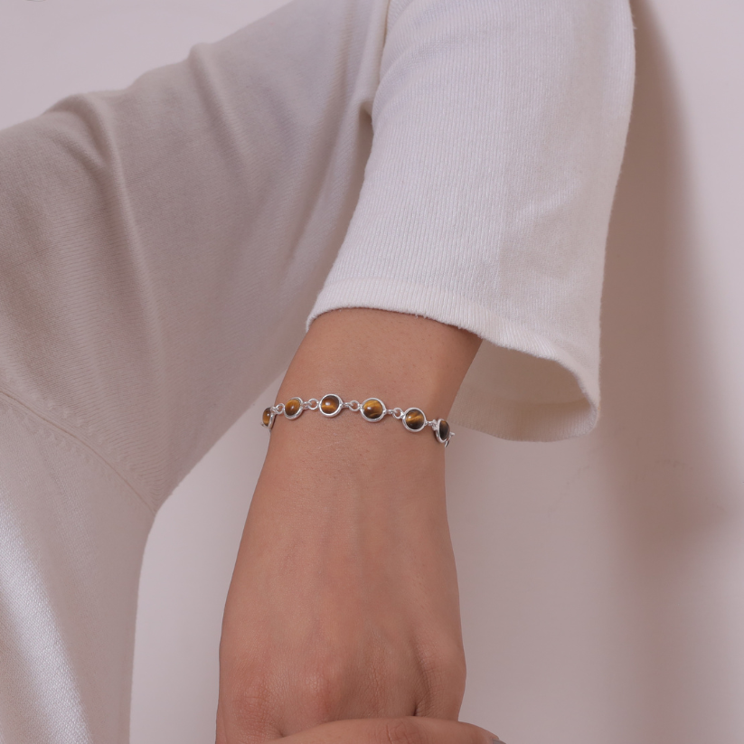 Elevate your style with the Tiger Eye Bracelet, a masterpiece that blends natural beauty with refined craftsmanship. The bracelet features a radiant Tiger Eye centerpiece, carefully cut to enhance its inherent allure and brilliance. Set in a band crafted from 925 sterling silver, it offers durability and a lasting shine that complements the gemstone’s warm golden-brown hues.