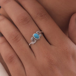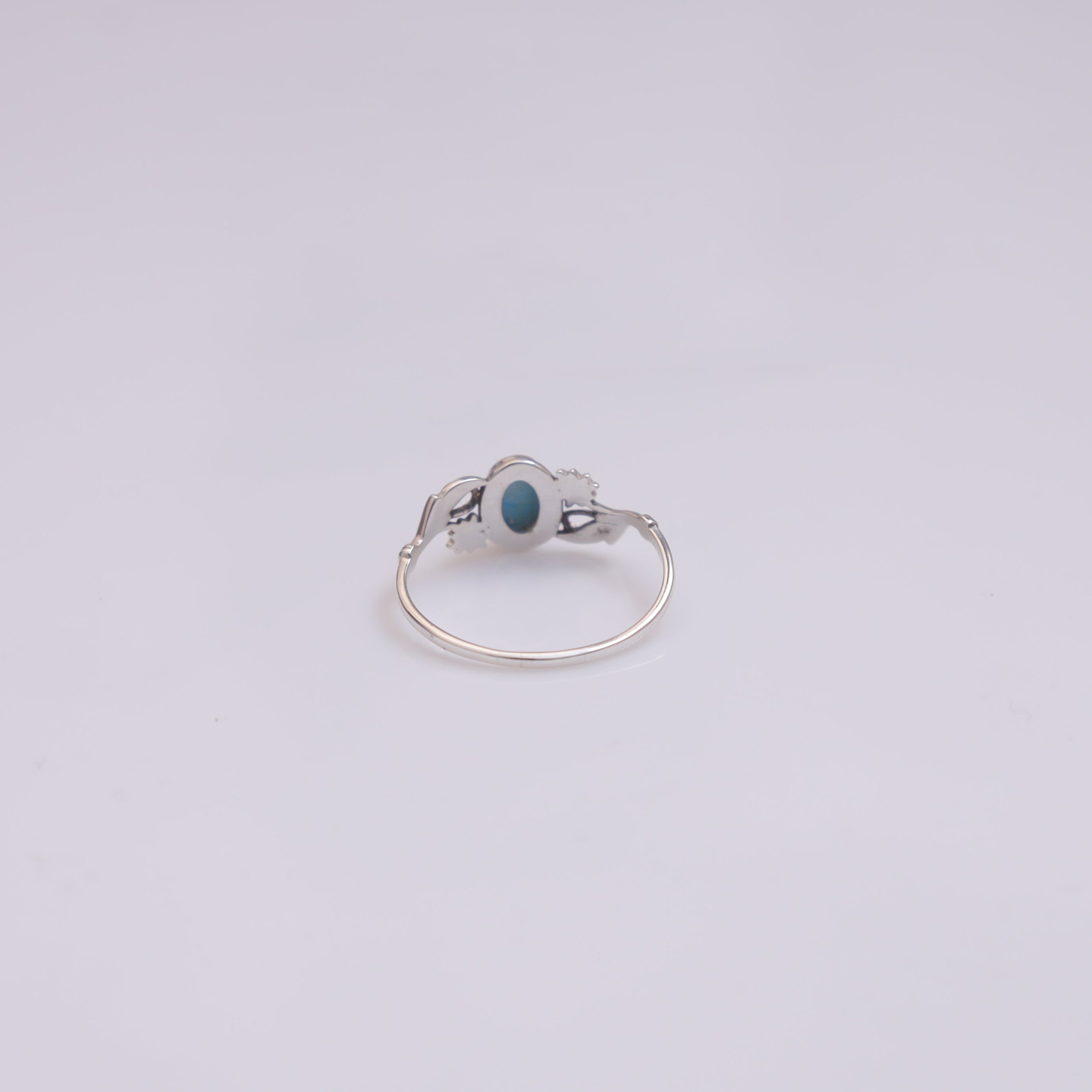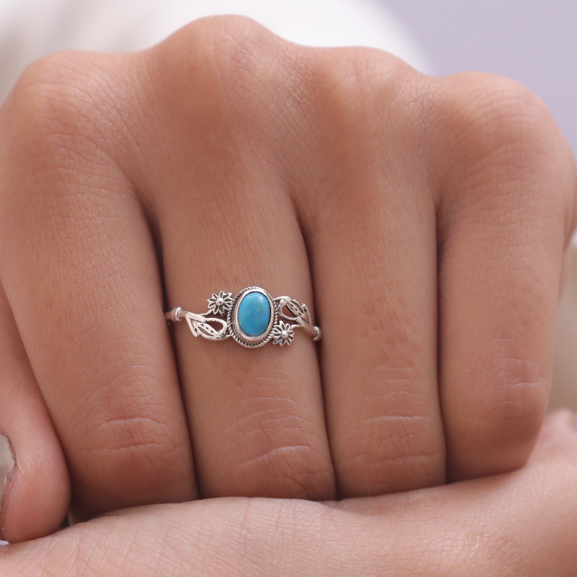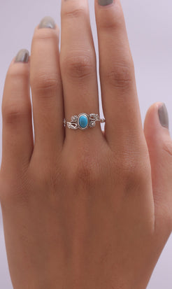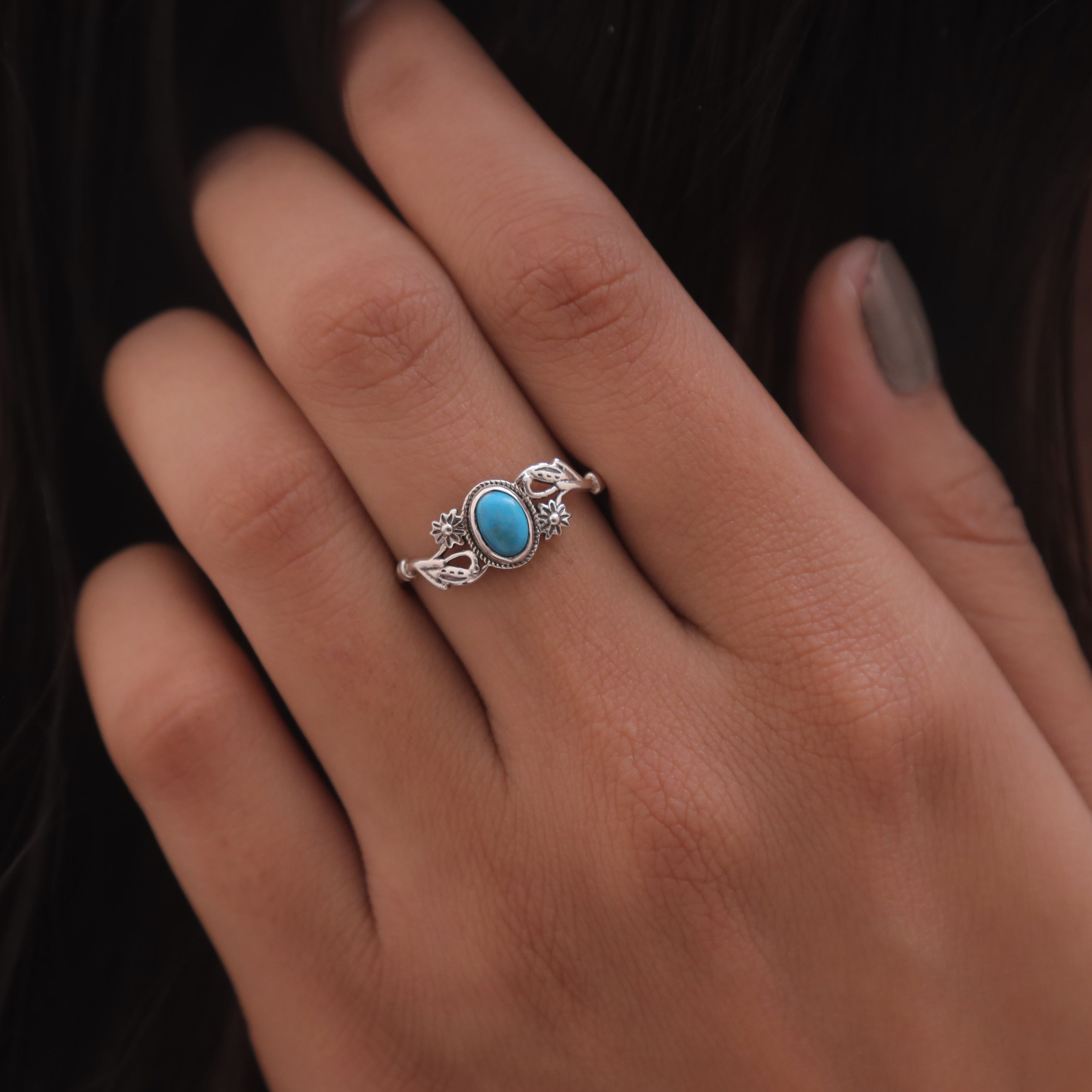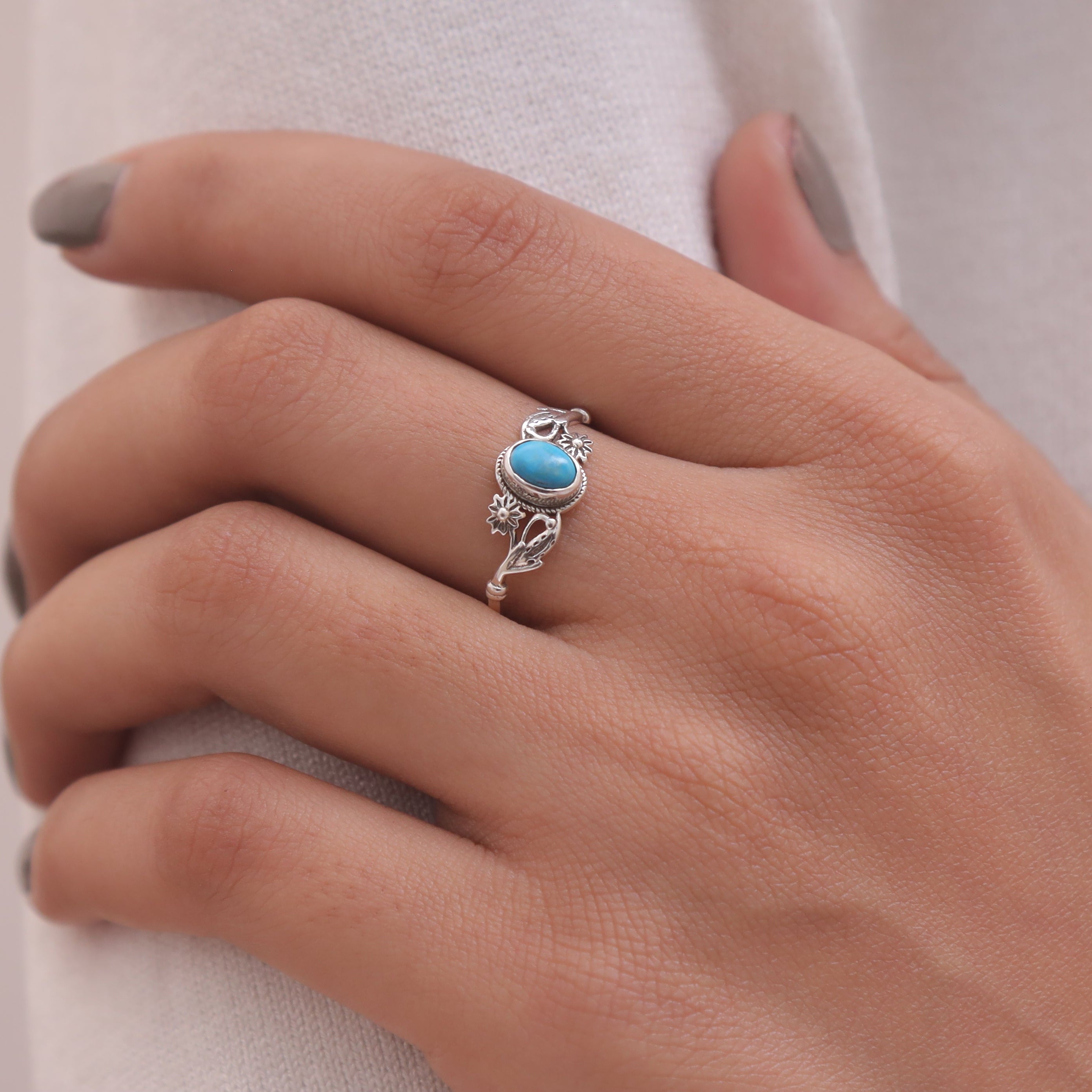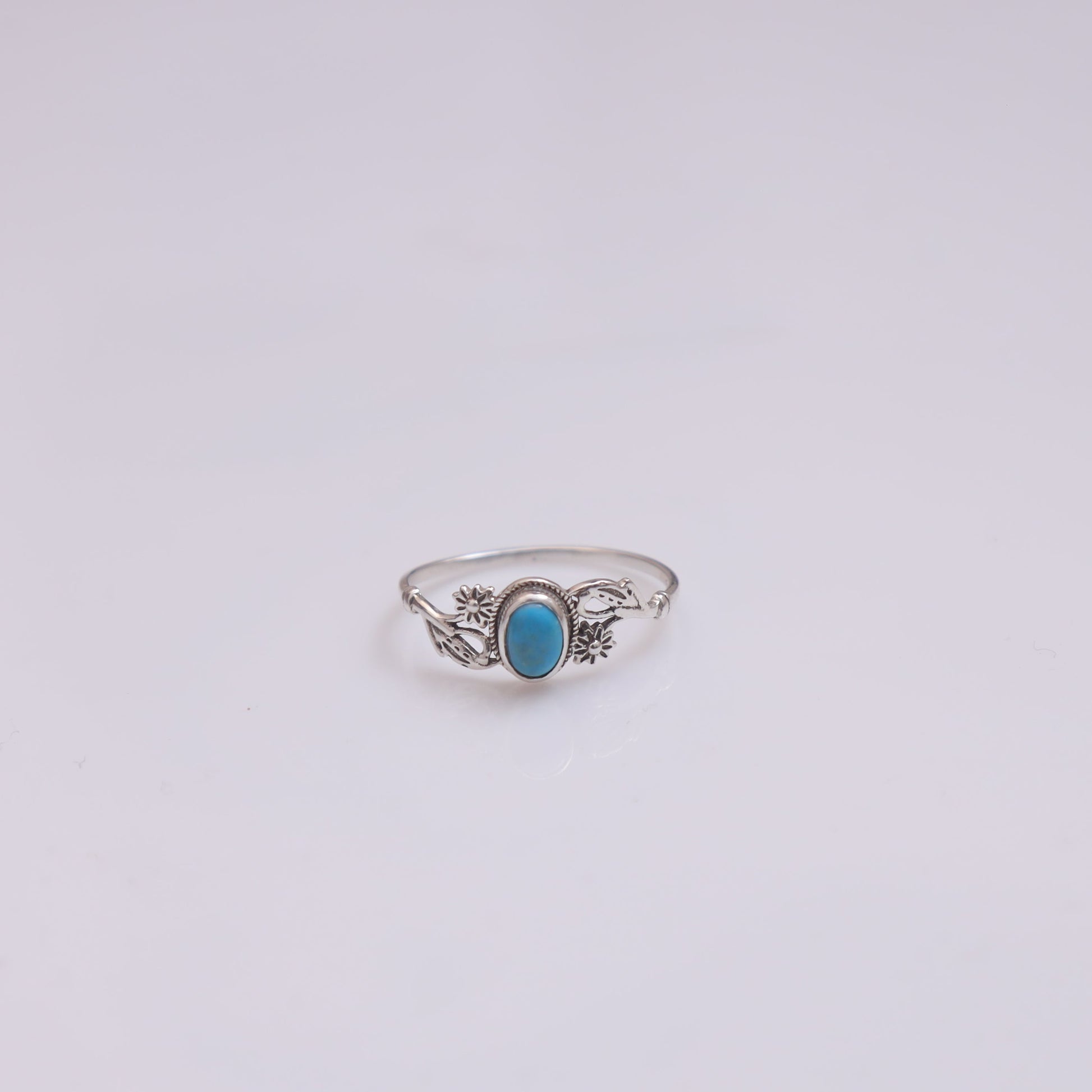 Each detail of the ring showcases expert craftsmanship, from the precisely set prongs securing the Turquoise to the polished silver band ensuring a comfortable fit. The design allows the Turquoise to shine as the focal point, making it a versatile accessory suitable for everyday wear or special occasions.