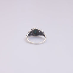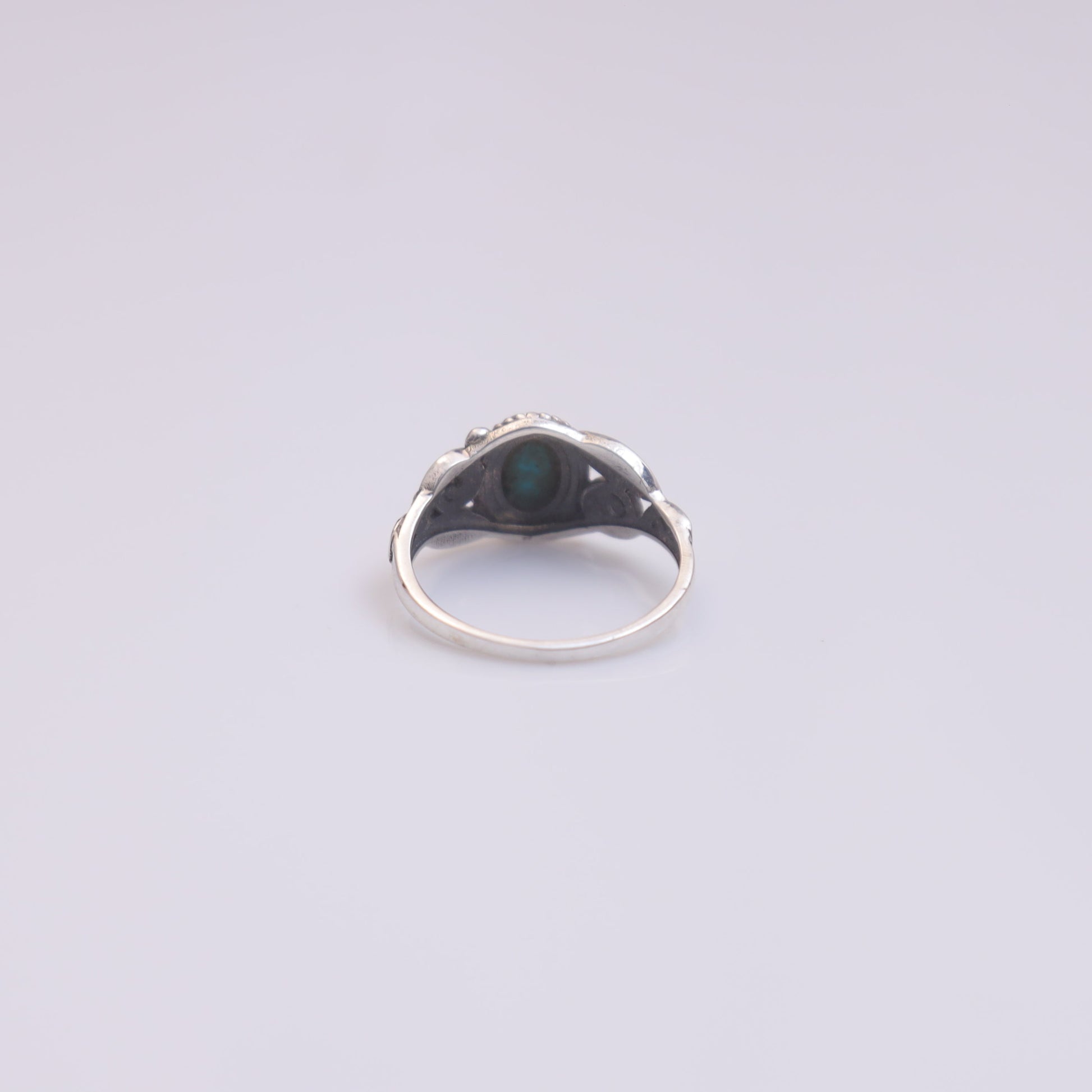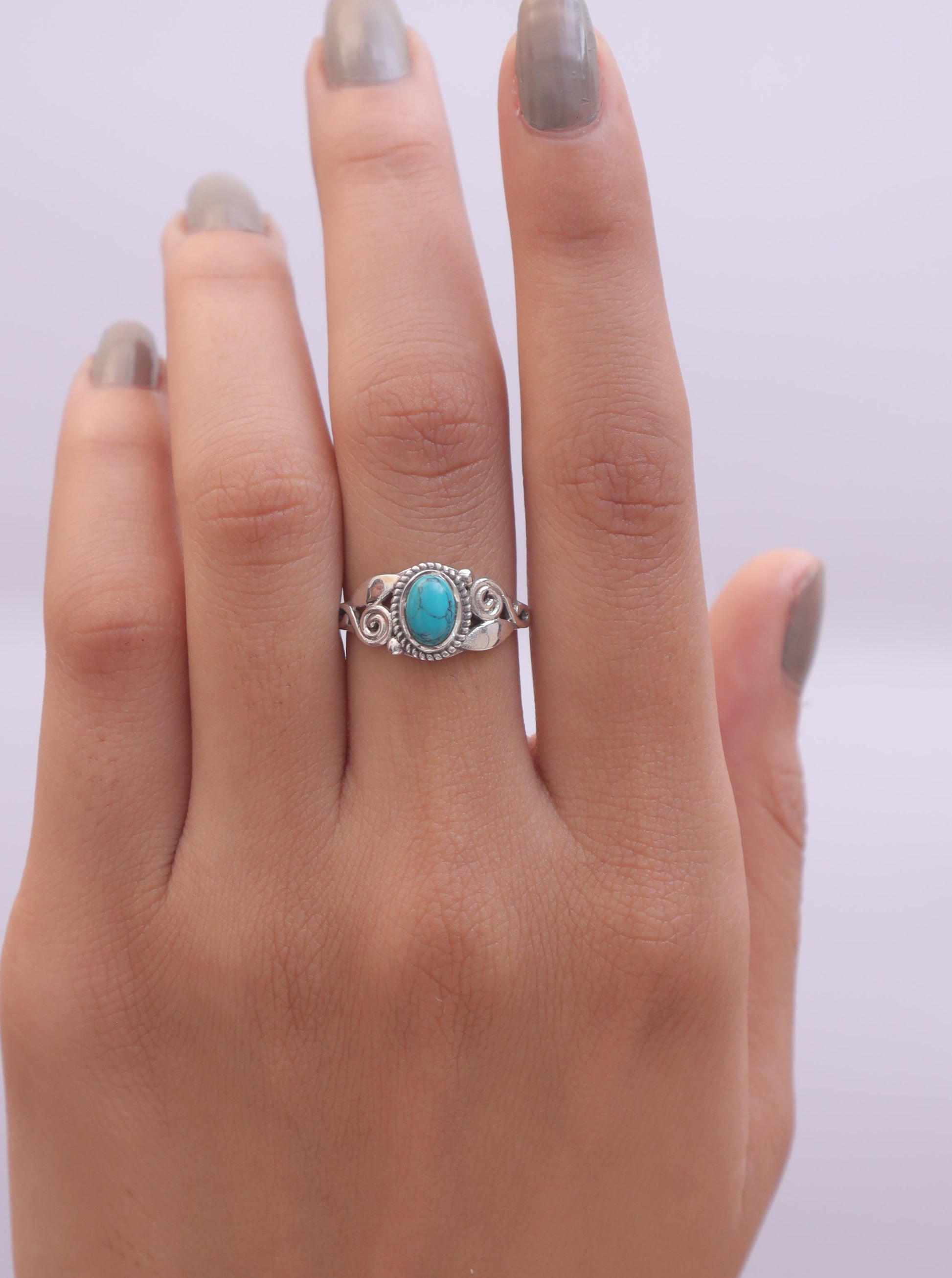 Each detail of the ring showcases expert craftsmanship, from the precisely set prongs securing the Turquoise to the polished silver band ensuring a comfortable fit. The design allows the Turquoise to shine as the focal point, making it a versatile accessory suitable for everyday wear or special occasions.