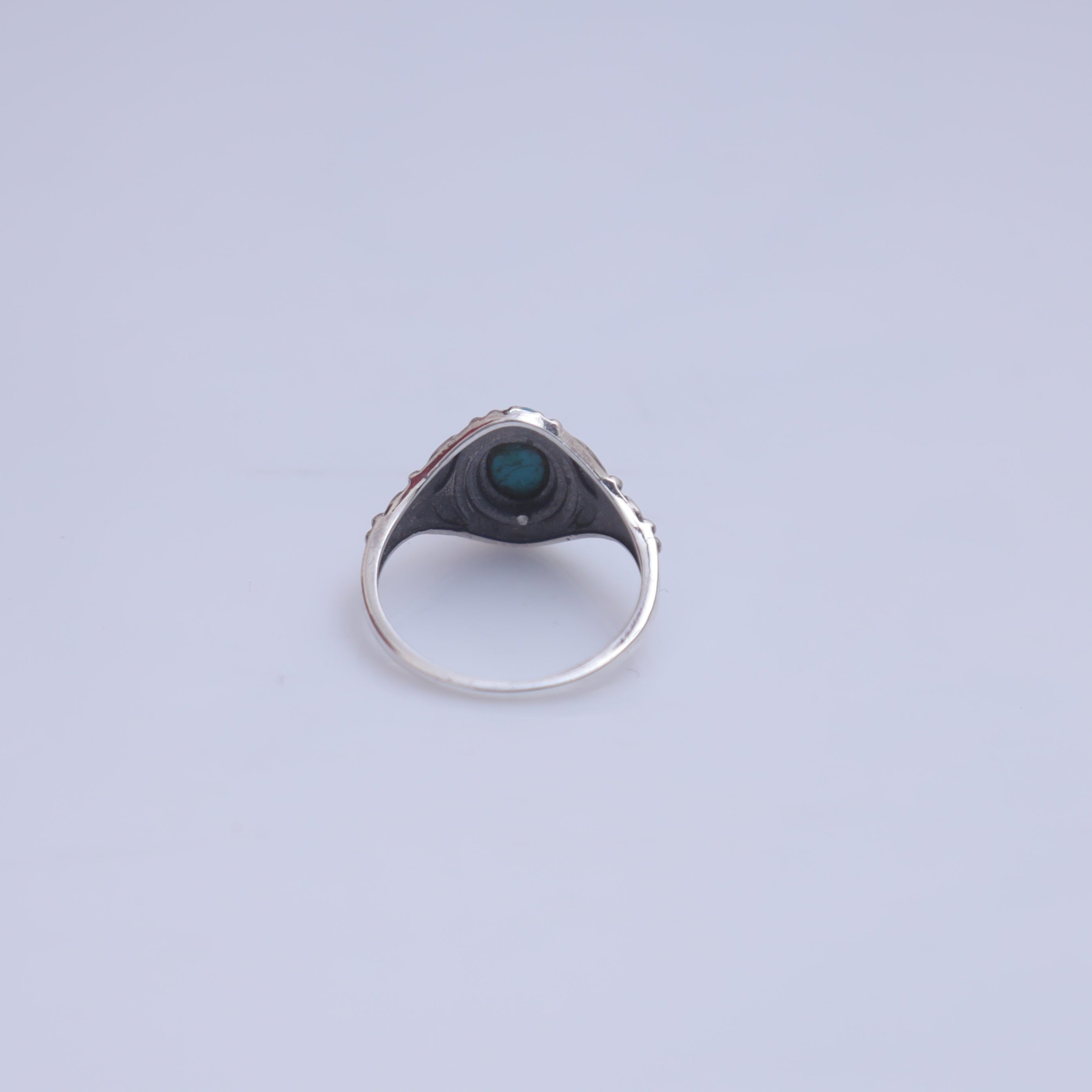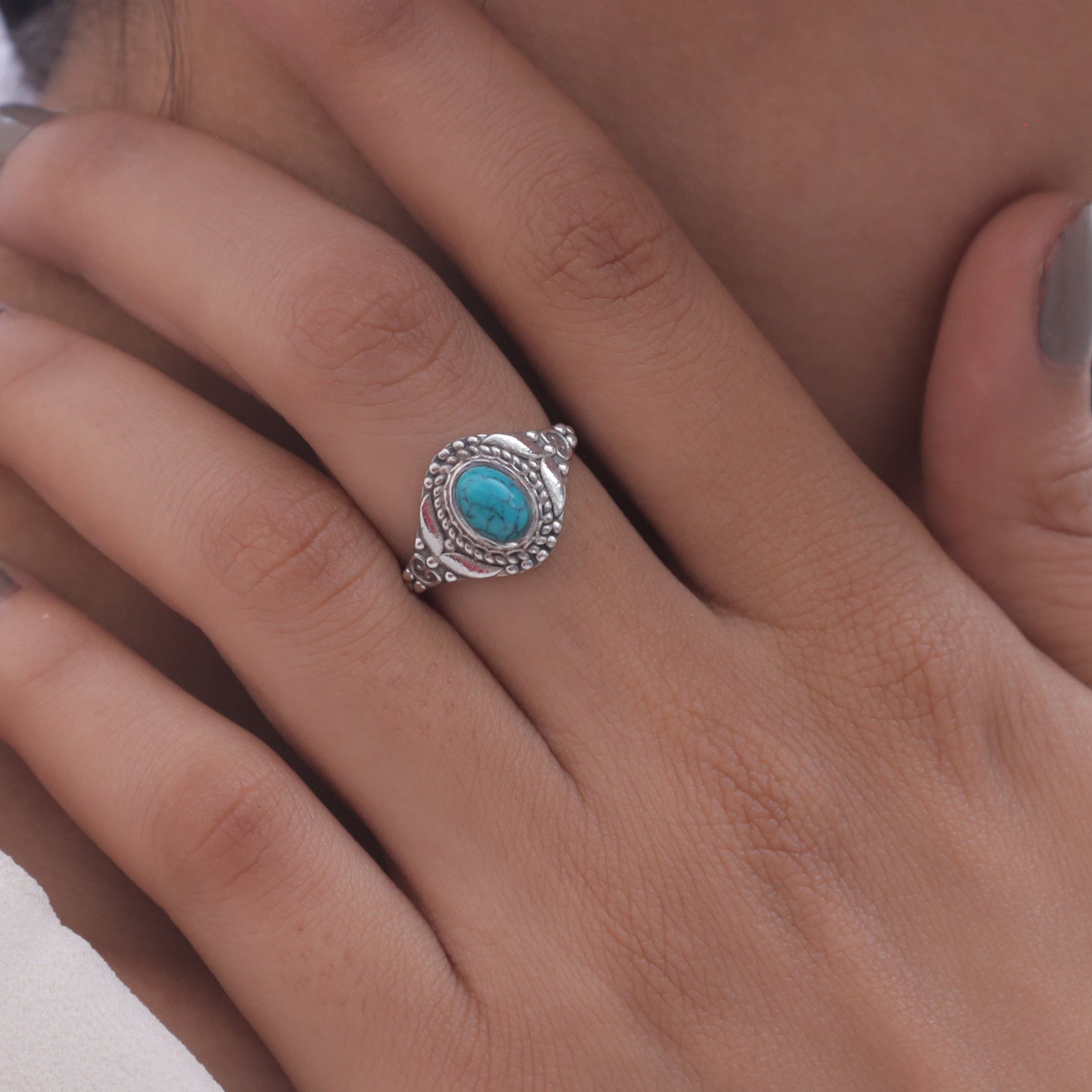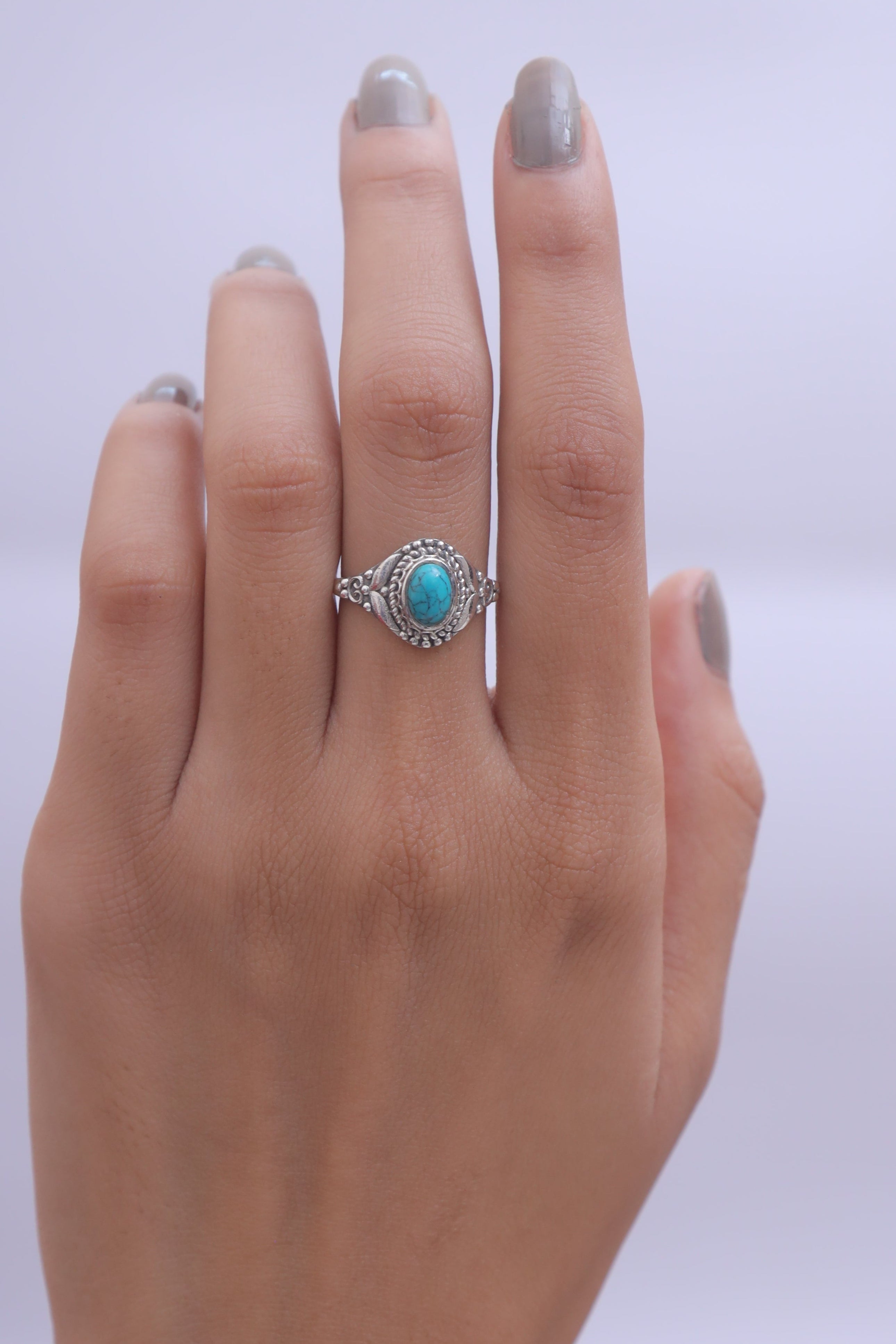 Each detail of the ring showcases expert craftsmanship, from the precisely set prongs securing the Turquoise to the polished silver band ensuring a comfortable fit. The design allows the Turquoise to shine as the focal point, making it a versatile accessory suitable for everyday wear or special occasions.